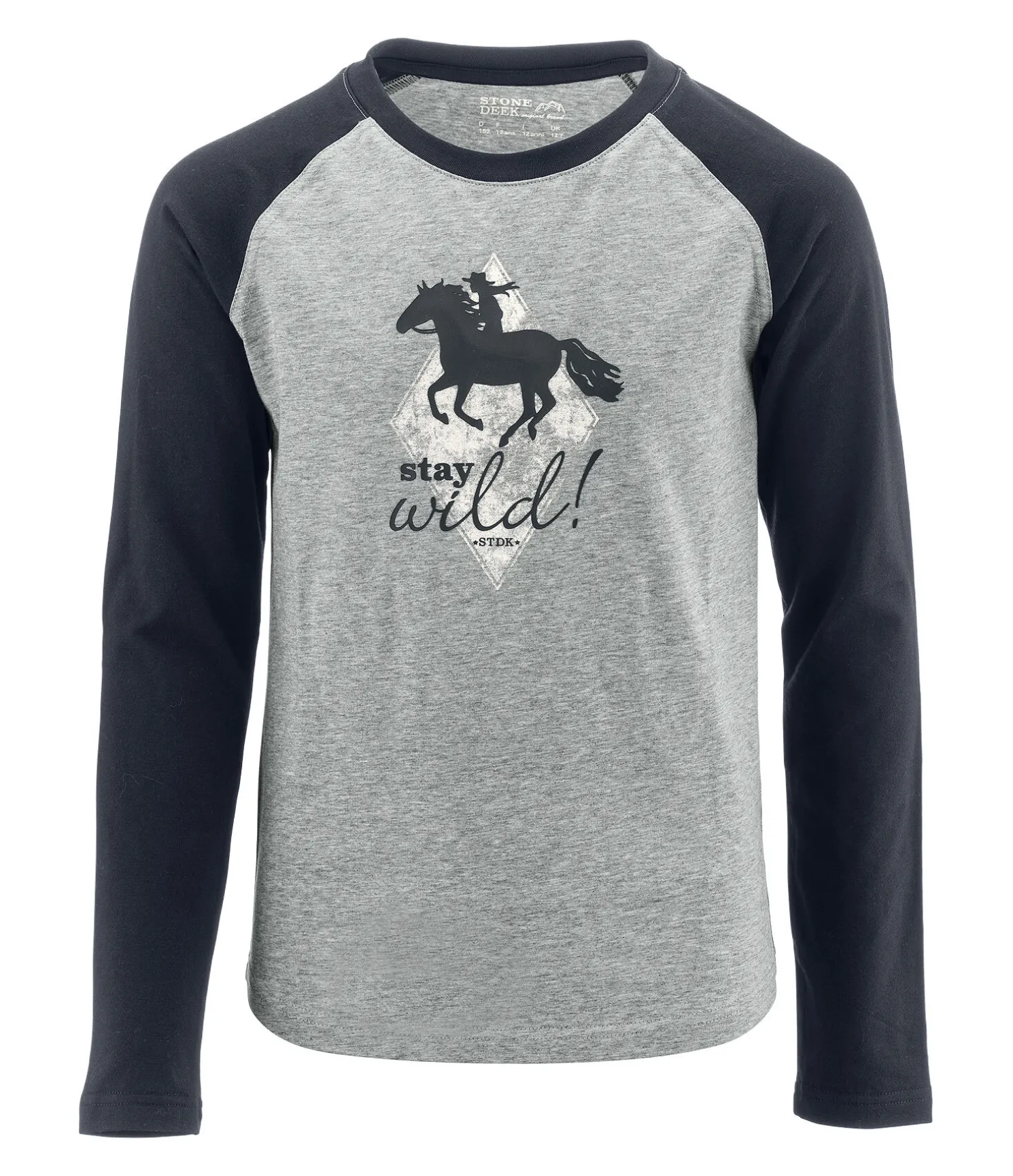 T-shirt à manches longues bicolore. Look décontracté avec motif western sur la poitrine. Manches raglan et col rond. 94 % coton, 6 % élasthanne.