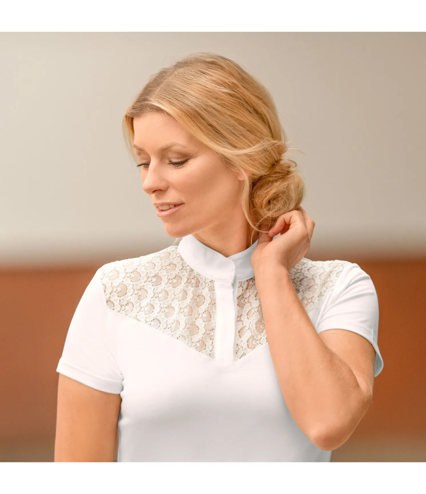 T-shirt de concours technique avec patte de boutonnage dissimulée. Col montant. Empiècement en dentelle. Matière douce, très extensible, respirante à séchage rapide. Boutons argentés. Logo Felix Bühler métallisé discret dans le haut du dos. 88 % polyester, 12 % élasthanne, dentelle : 92 % polyamide, 8 % élasthanne.