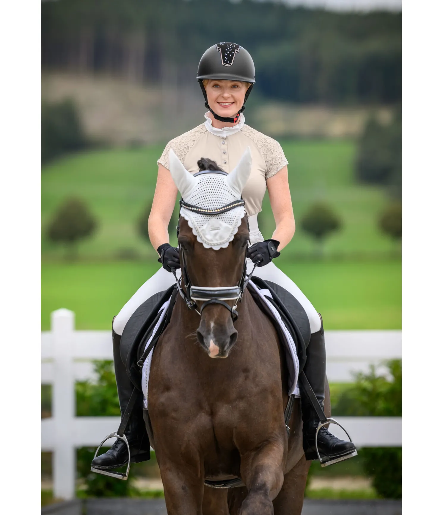 T-shirt de concours technique. Matière très extensible, respirante à séchage rapide. Manches en dentelle douce. Col volanté. Broderie Felix Bühler sur la poitrine et boutons paillettés. 88 % polyester, 12 % élasthanne.