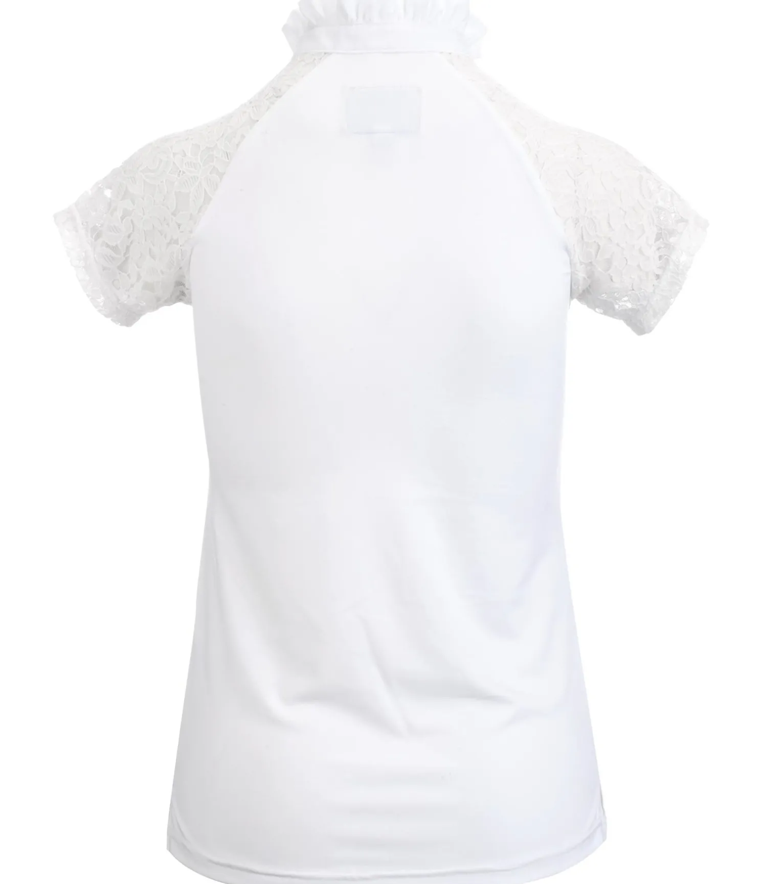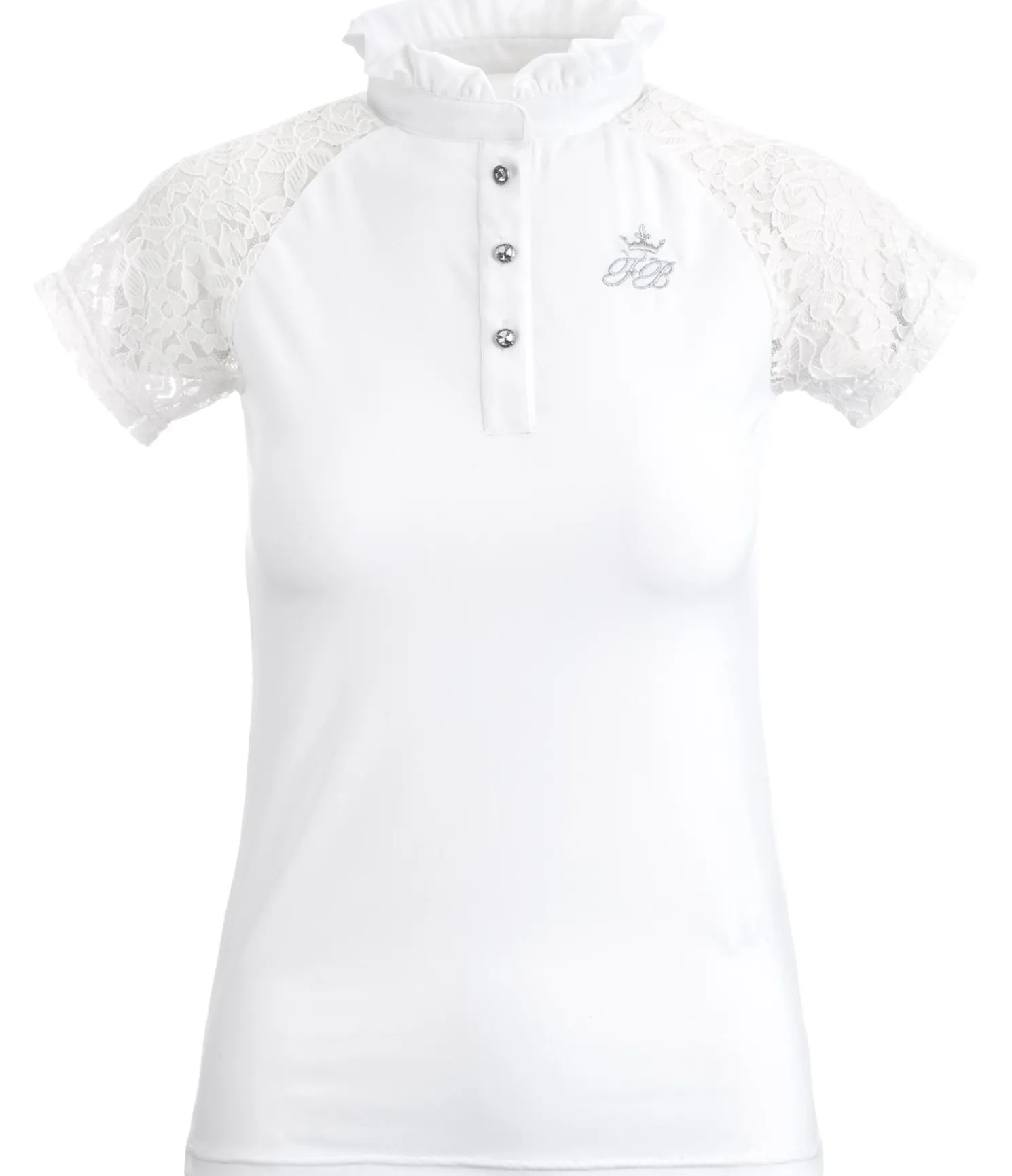 T-shirt de concours technique. Matière très extensible, respirante à séchage rapide. Manches en dentelle douce. Col volanté. Broderie Felix Bühler sur la poitrine et boutons paillettés. 88 % polyester, 12 % élasthanne.
