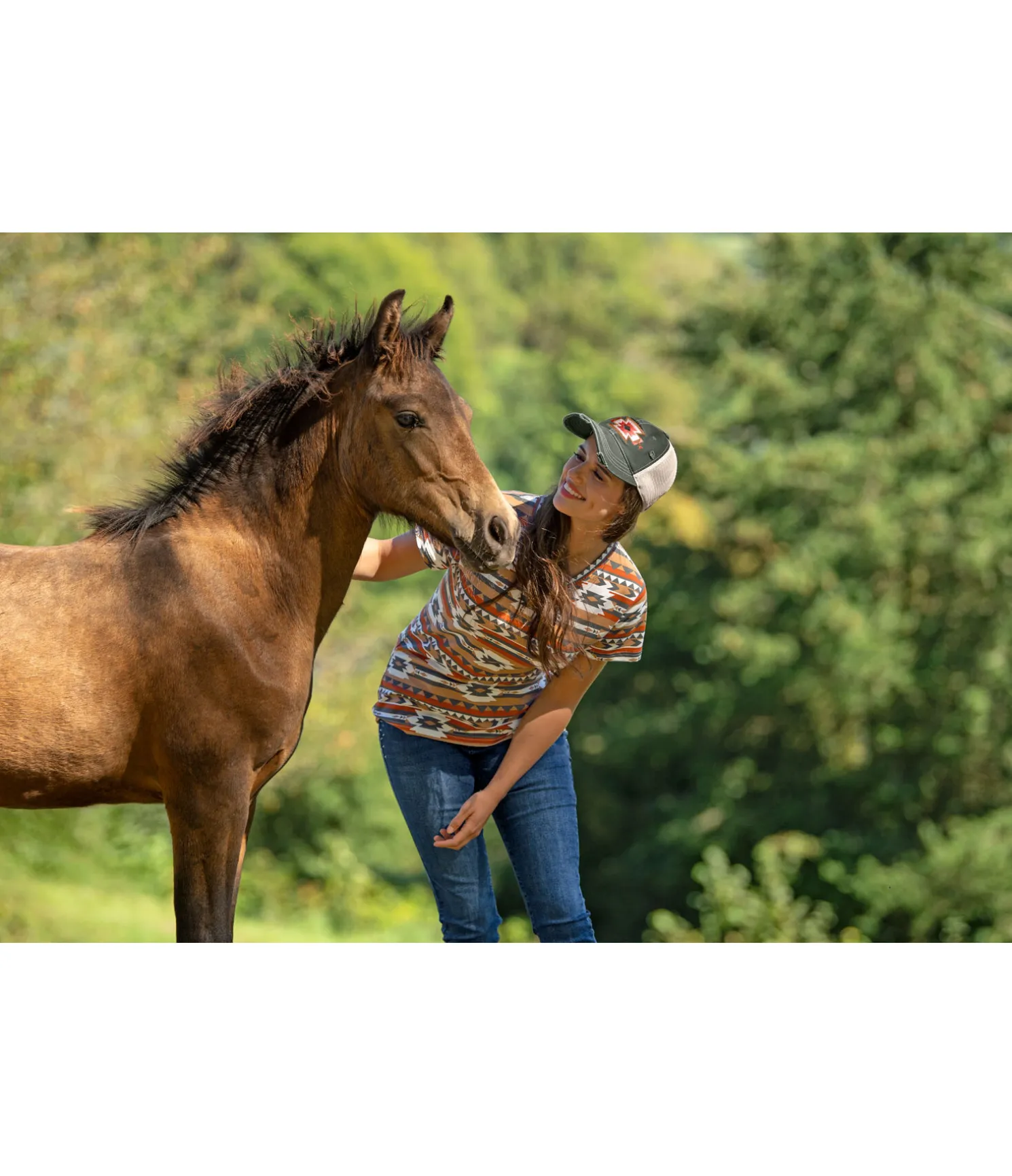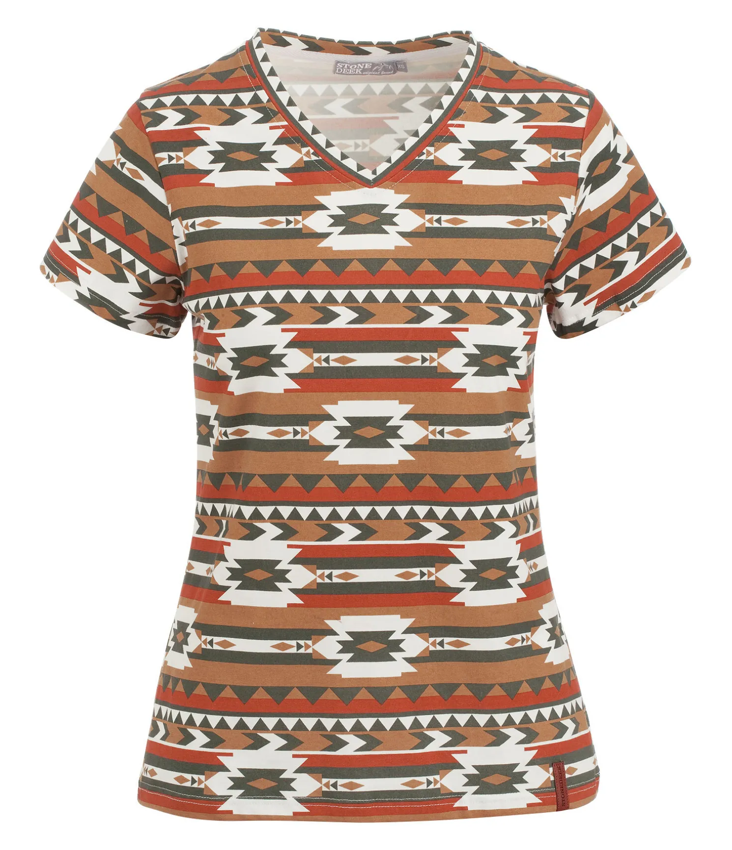 T-shirt à col V. Motif aztèque all-over. Matière respirante. 95 % coton, 5 % élasthanne.