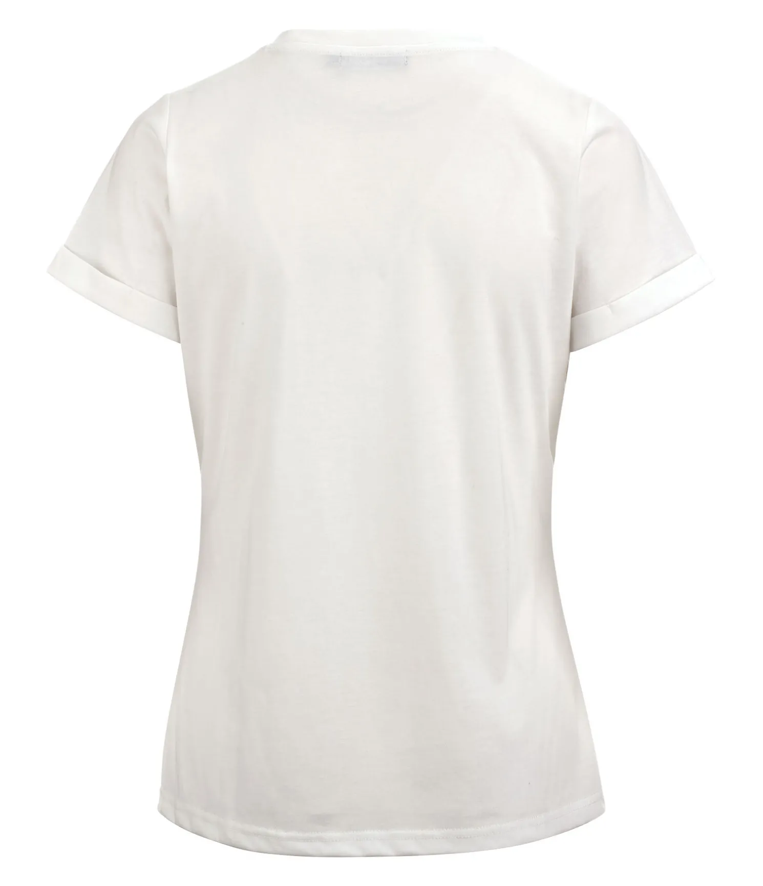 T-shirt doux à col rond. Motif sur la poitrine. Matière respirante. 65 % polyester, 35 % coton.