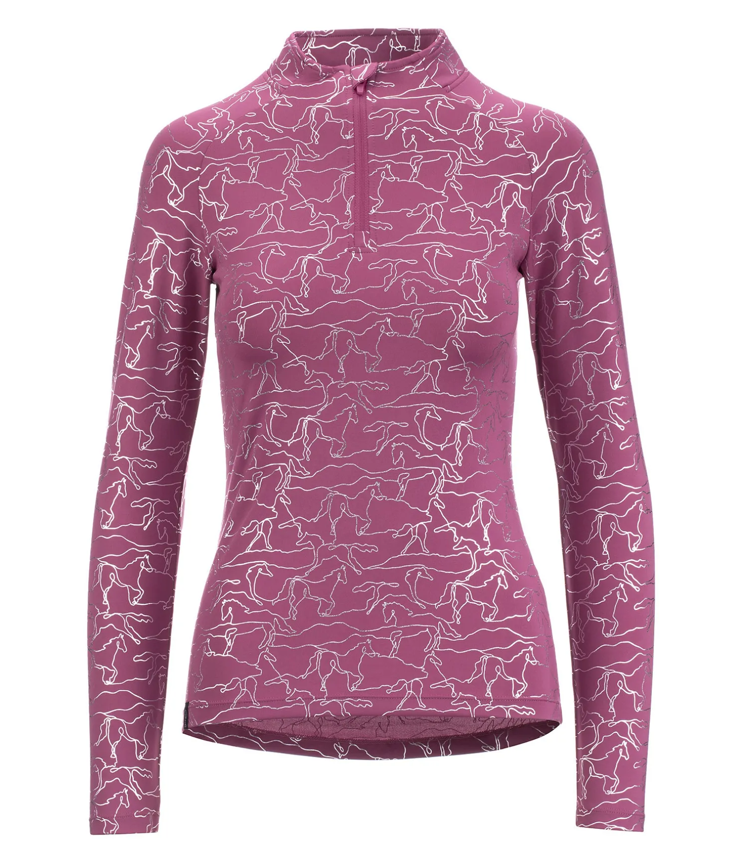 T-shirt technique à manches longues. Imprimé métallisé cheval all-over. Manches raglan. Col montant zippé avec protège-menton. Matière respirante. Séchage rapide. 88 % polyester, 12 % élasthanne.