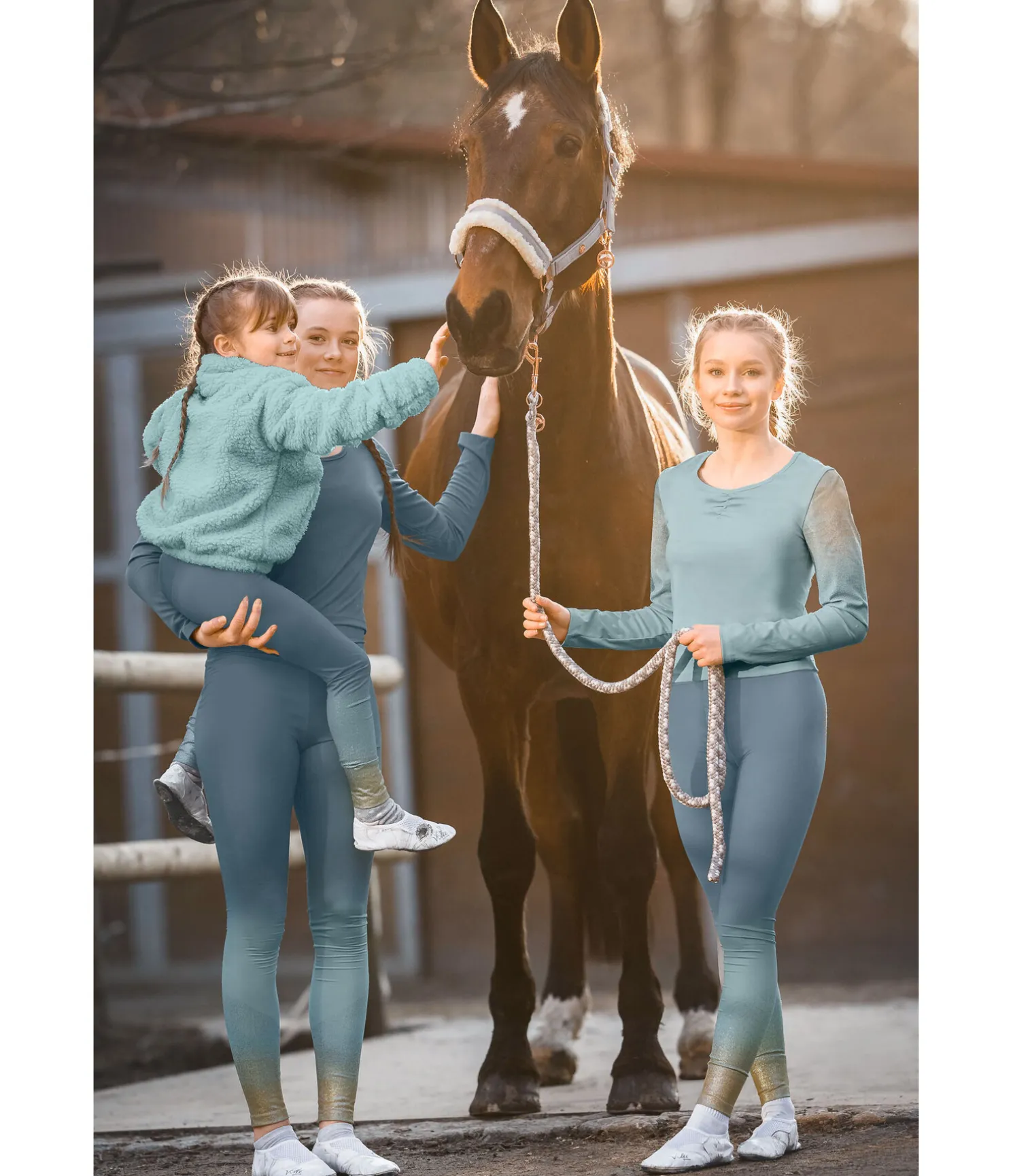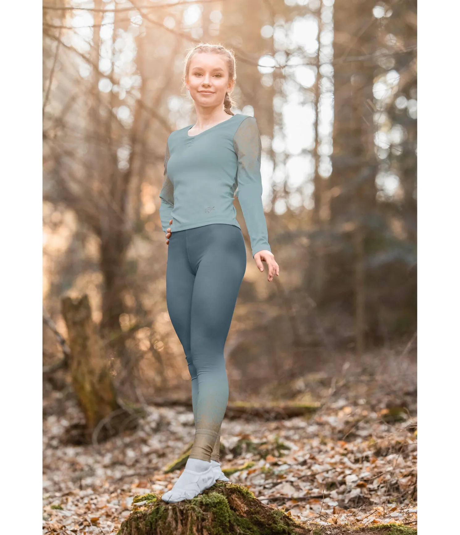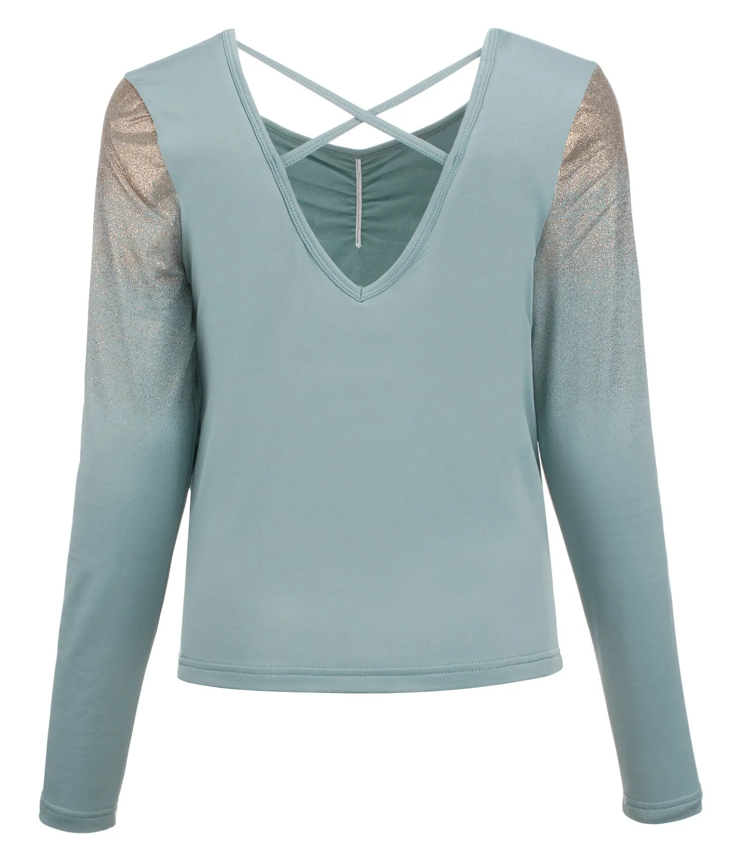 T-shirt avec large col rond. Intérieur molletonné et chaud. Découpe en V avec lanières croisées dans le dos. Superbe dégradé scintillant rose doré partant de l’épaule. Matière respirante à séchage rapide. 80 % nylon, 20 % élasthanne.