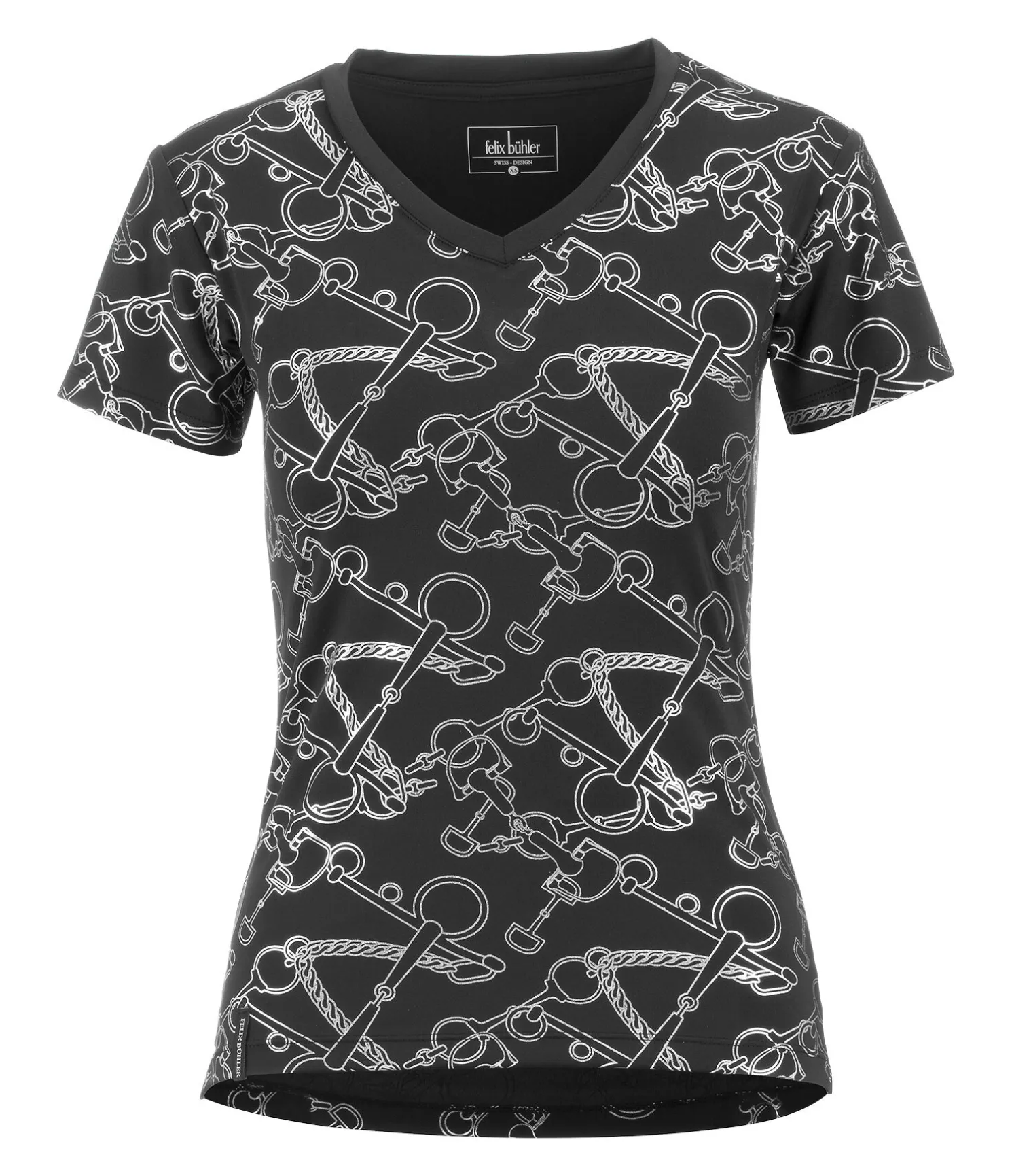 Élégant T-shirt technique à manches courtes. Col en V. Imprimé all-over couleur métallisée. Respirant et à séchage rapide. 88 % polyester, 12 % élasthanne
