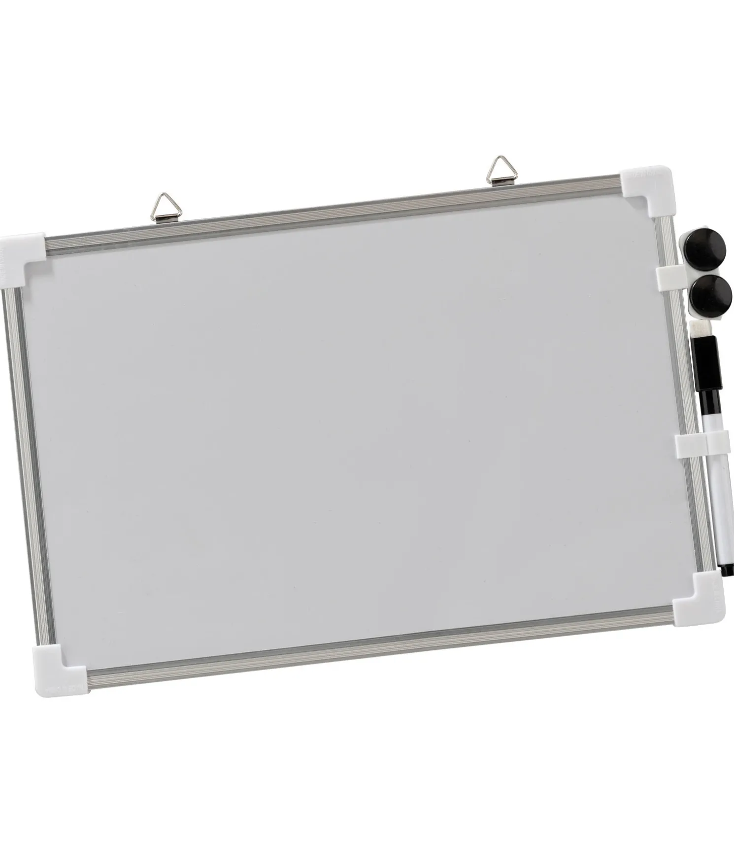 Tableau-ardoise en métal blanc effaçable et réinscriptible à l’infini. Deux oeillets pratiques pour le suspendre. 1 marqueur effaçable et deux aimants pour fixer des documents. 30 x 20 cm.