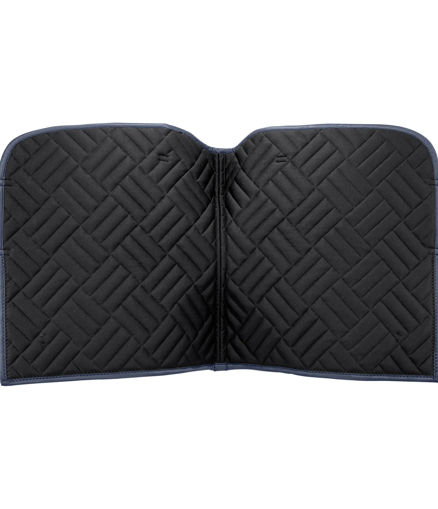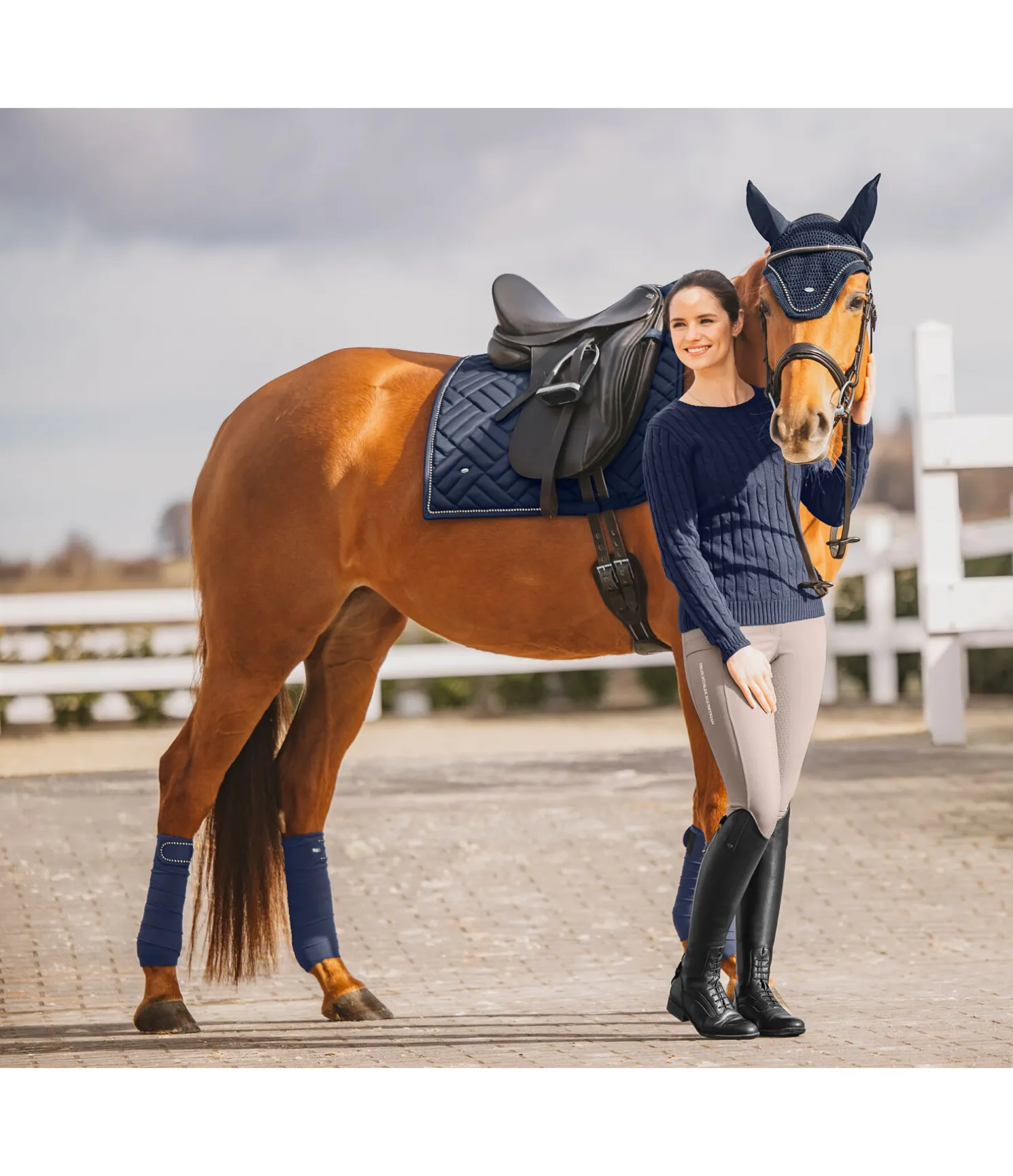 Tapis de selle de forme carrée, particulièrement élégant, avec surpiqûres apparentes. Passepoil avec strass. Petit médaillon discret avec logo gravé. Passants de sangle et de contre-sanglons avec patte auto-agrippante fonctionnelle. Dessous Air mesh respirant et absorbant l’humidité. 100 % polyester.