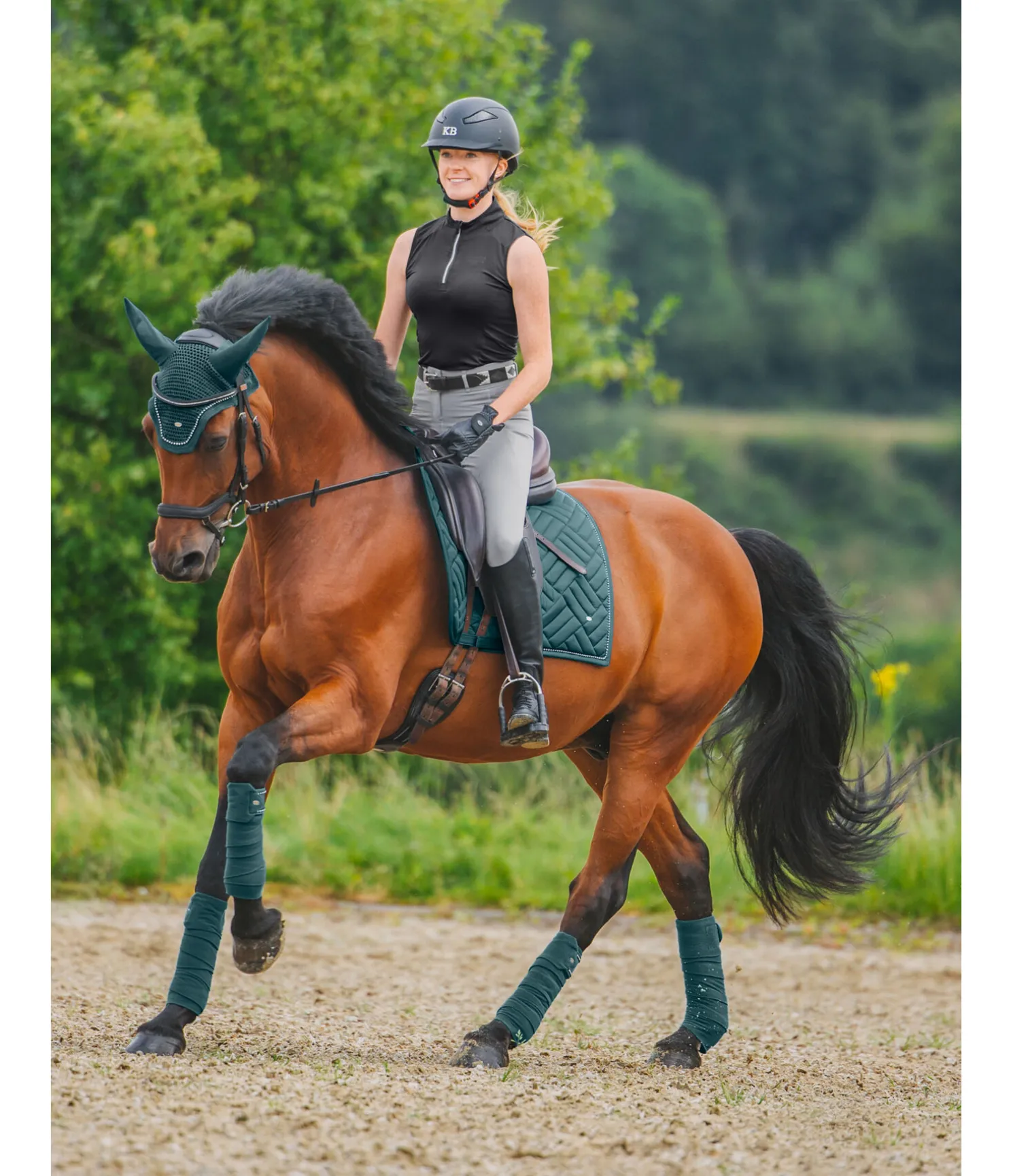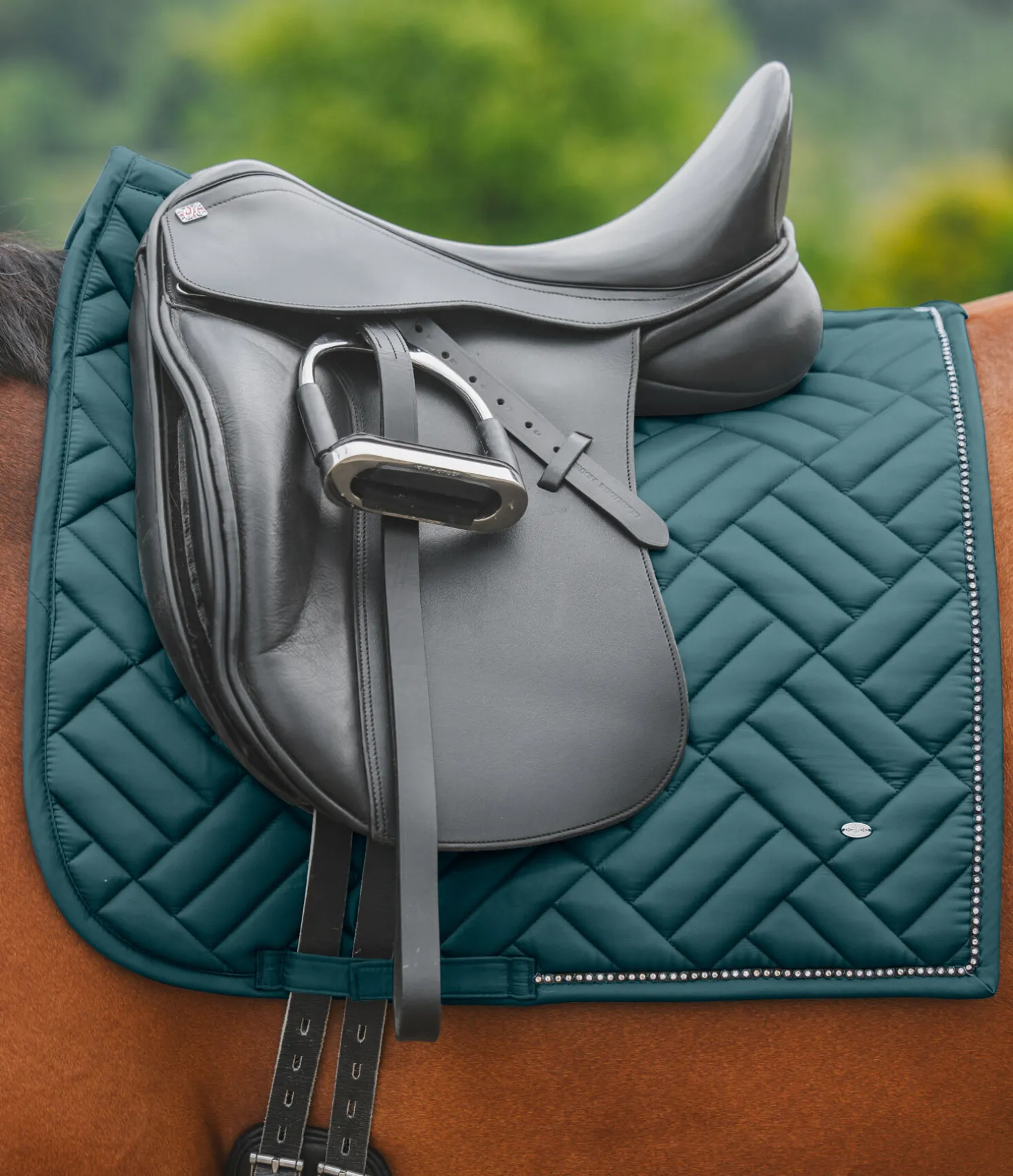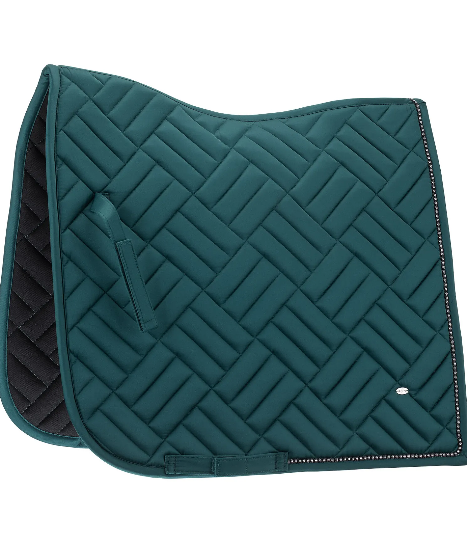 Tapis de selle de forme carrée, particulièrement élégant, avec surpiqûres apparentes. Passepoil avec strass. Petit médaillon discret avec logo gravé. Passants de sangle et de contre-sanglons avec patte auto-agrippante fonctionnelle. Dessous Air mesh respirant et absorbant l’humidité. 100 % polyester.