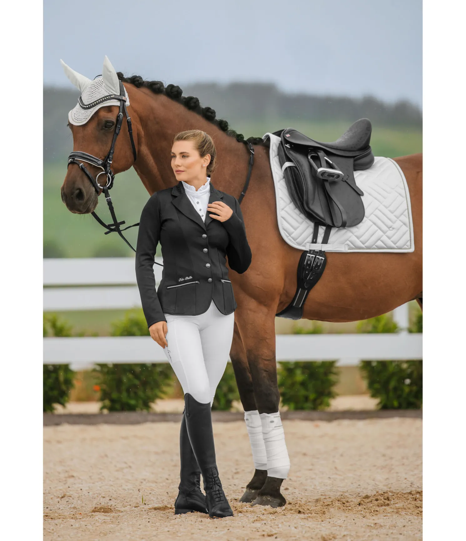 Tapis de selle de forme carrée, particulièrement élégant, avec surpiqûres apparentes. Passepoil avec strass. Petit médaillon discret avec logo gravé. Passants de sangle et de contre-sanglons avec patte auto-agrippante fonctionnelle. Dessous Air mesh respirant et absorbant l’humidité. 100 % polyester.