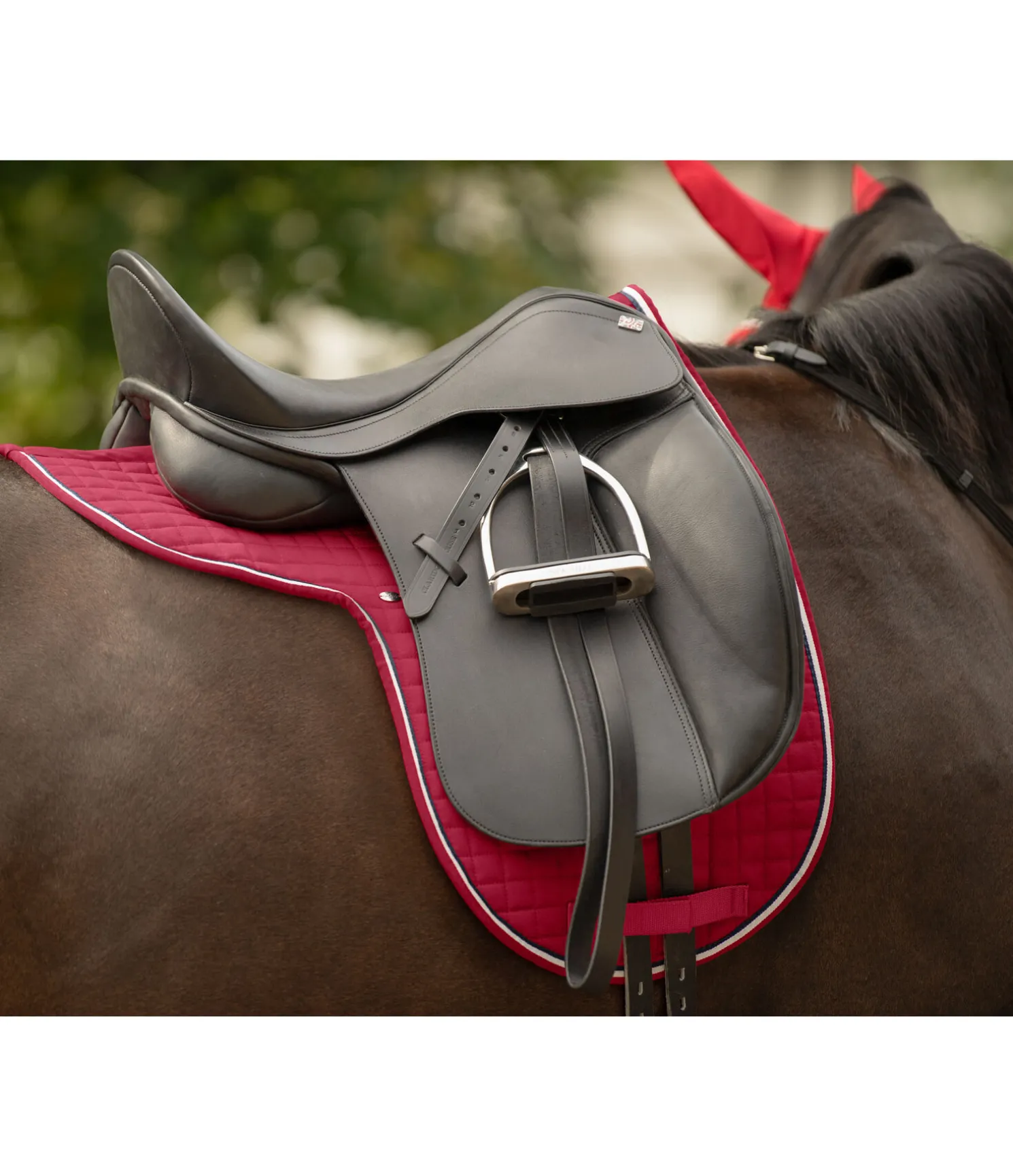 Tapis de selle classique et respirant, ce qui permet de moins couvrir la robe du cheval tout en assurant une protection optimale. Plaque métallique discrète avec logo gravé et bordure rayée de couleur contrastante. Passants de sangle et de contre-sanglons avec patte auto-agrippante. Dessous en Air Mesh respirant et absorbant l’humidité. Dessus 100 % coton, dessous et rembourrage 100 % polyester.