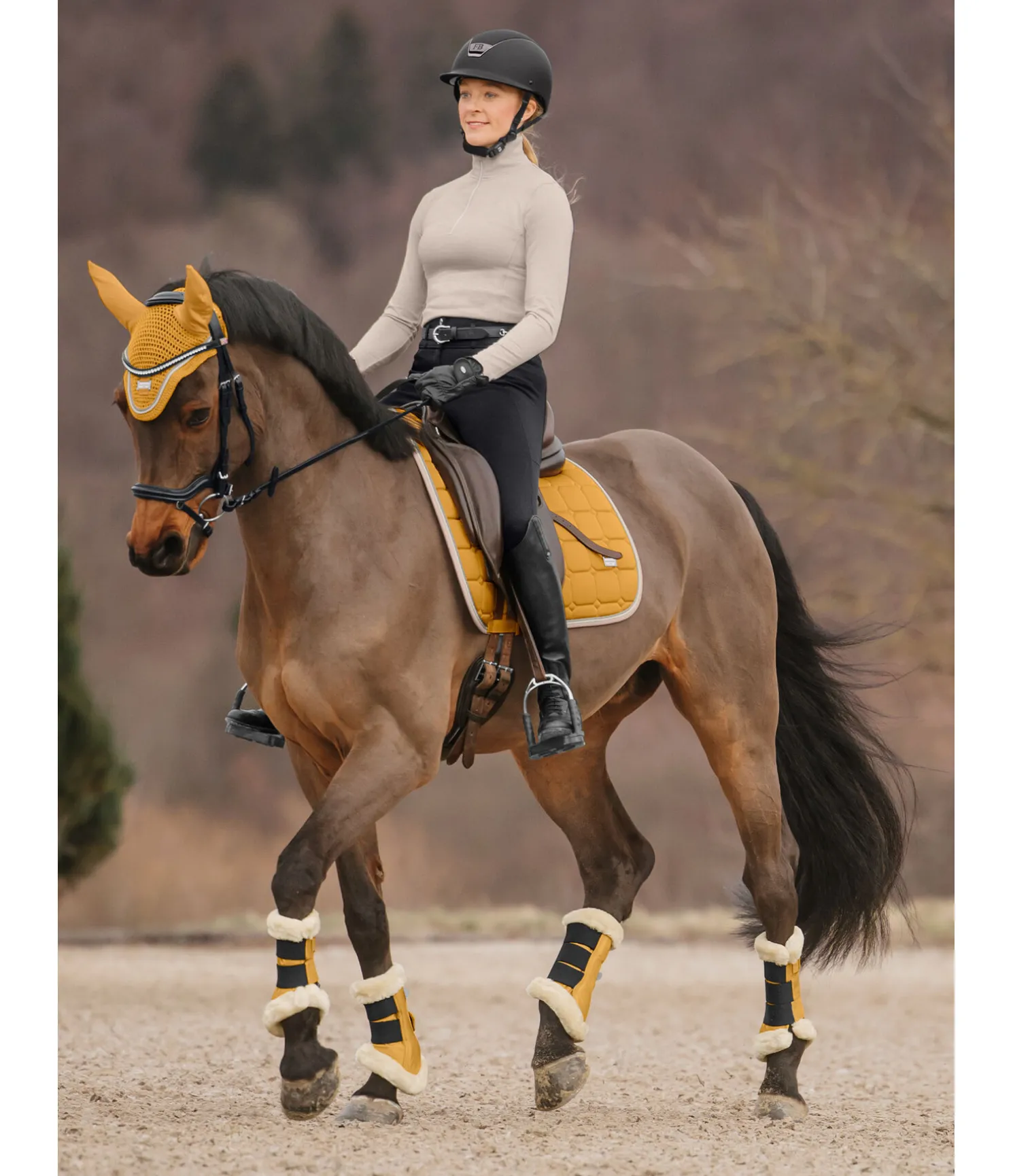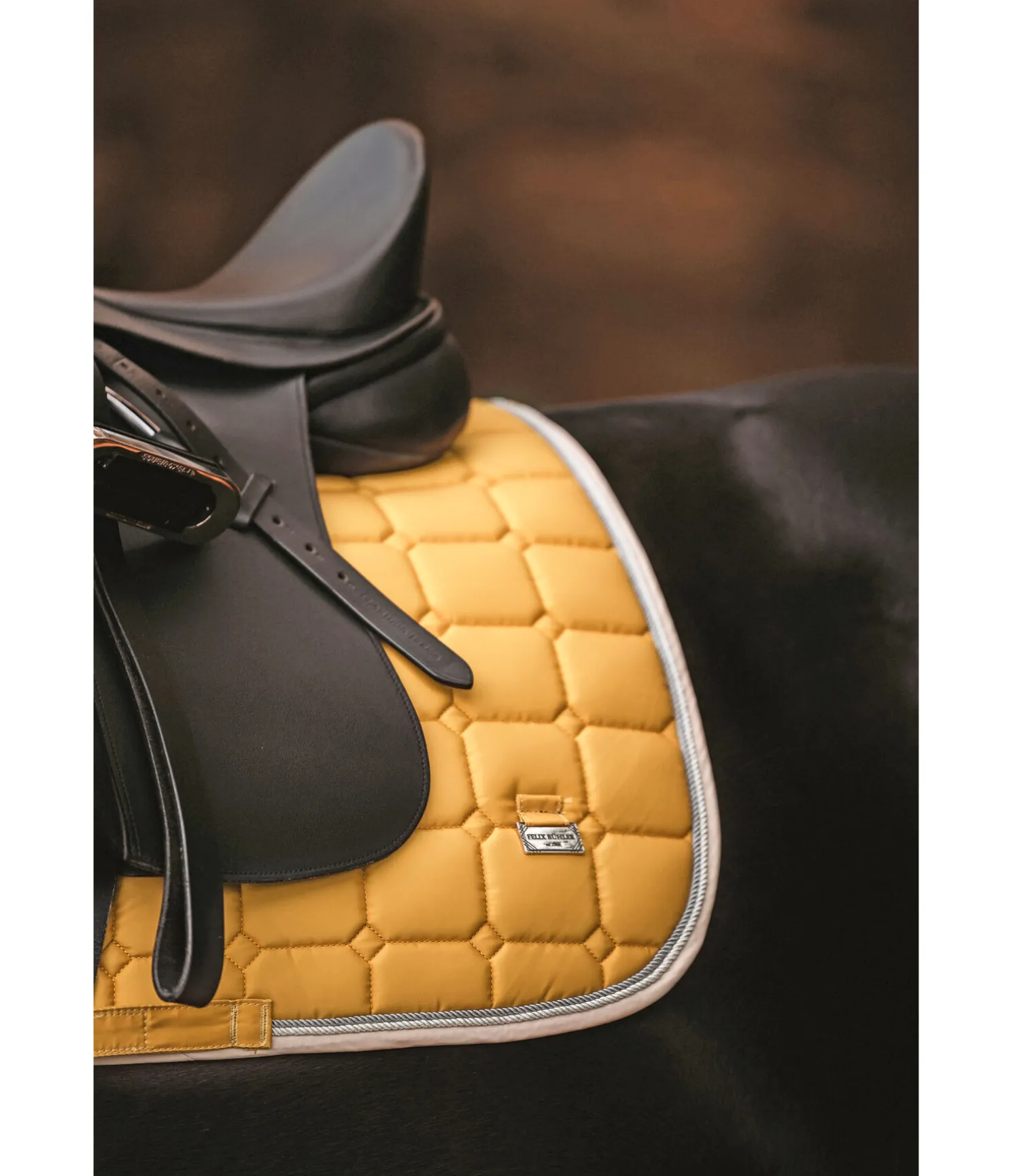 Tapis de selle élégant en tissu satiné et brillant avec grip en silicone dans la zone de la selle pour un maintien idéal. Détails élégants comme le double cordon décoratif et une plaque métallique de couleur assortie avec logo de chaque côté. Passants de sangle et de contre-sanglons avec patte auto-agrippante pratique. Doublure en mesh respirant et absorbant l’humidité. 100 % polyester.