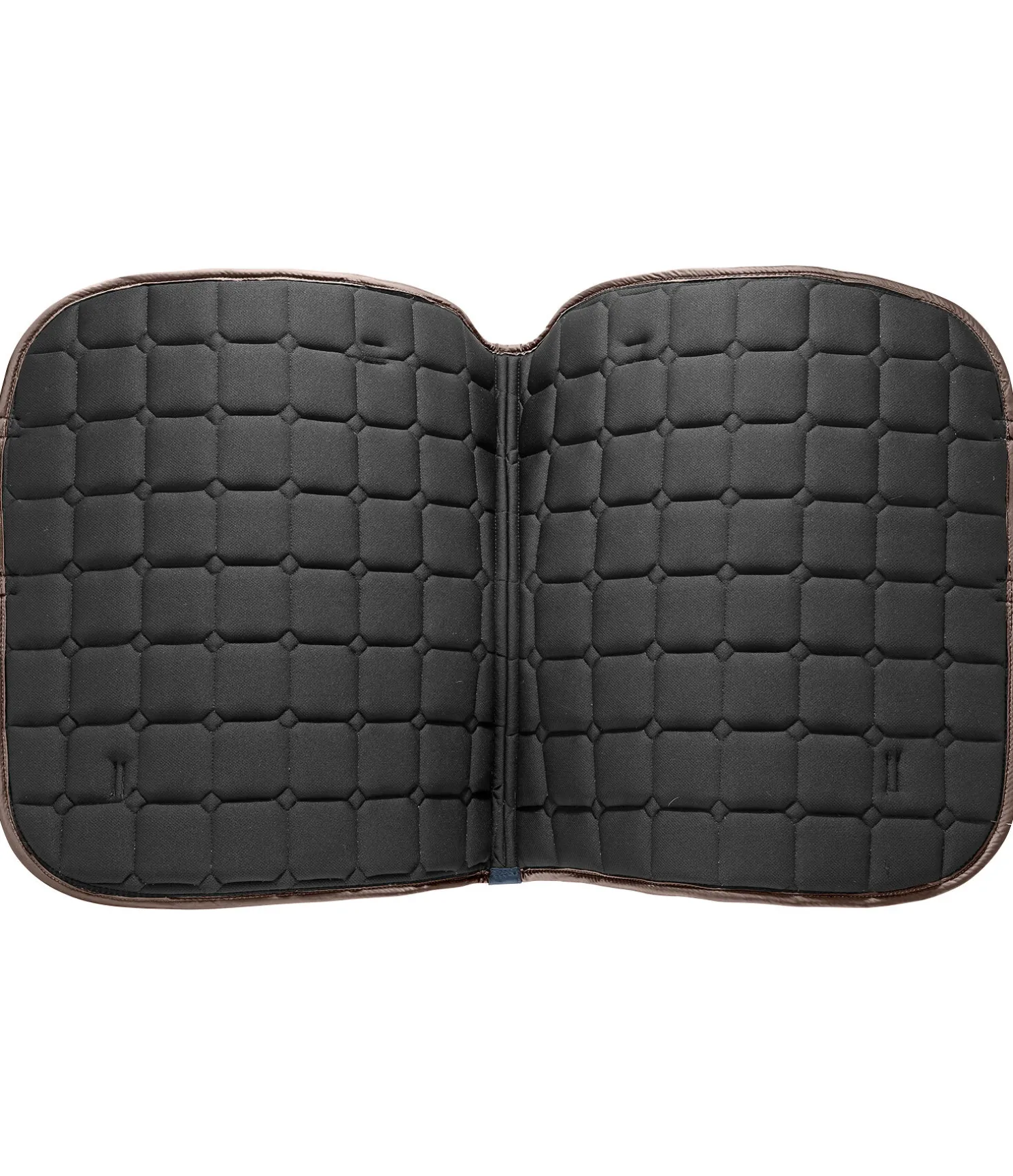 Tapis de selle élégant en tissu satiné et brillant avec grip en silicone dans la zone de la selle pour un maintien idéal. Détails élégants comme le double cordon décoratif et une plaque métallique de couleur assortie avec logo de chaque côté. Passants de sangle et de contre-sanglons avec patte auto-agrippante pratique. Doublure en mesh respirant et absorbant l’humidité. 100 % polyester.