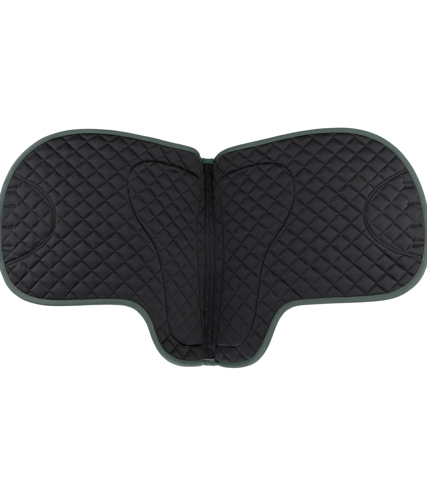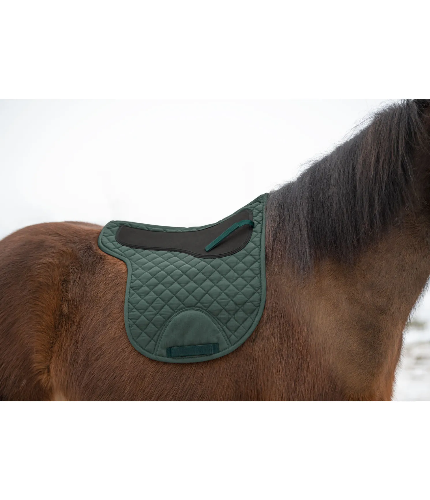 Tapis de selle en forme anatomique. Matière respirante. Pad en mousse cousu pour soulager le dos du cheval et empêcher la selle de glisser. Passage de contre-sanglons avec patte auto-agrippante. Longueur du dos 56 cm, hauteur 56 cm. 80 % polyester, 20 % coton.