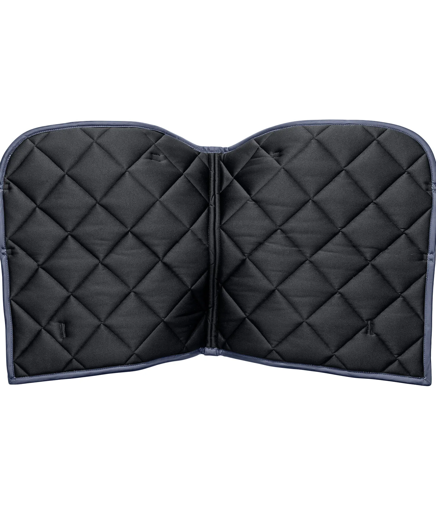 Élégant tapis de selle de forme carrée avec plaque logo métallique de chaque côté. Cordon décoratif anthracite et imprimé all-over discret à motif mors tendance. Passants de sangle et de contre-sanglons avec pattes auto-agrippantes pratiques. Dessous en Air mesh respirant et absorbant l’humidité. 100 % polyester.