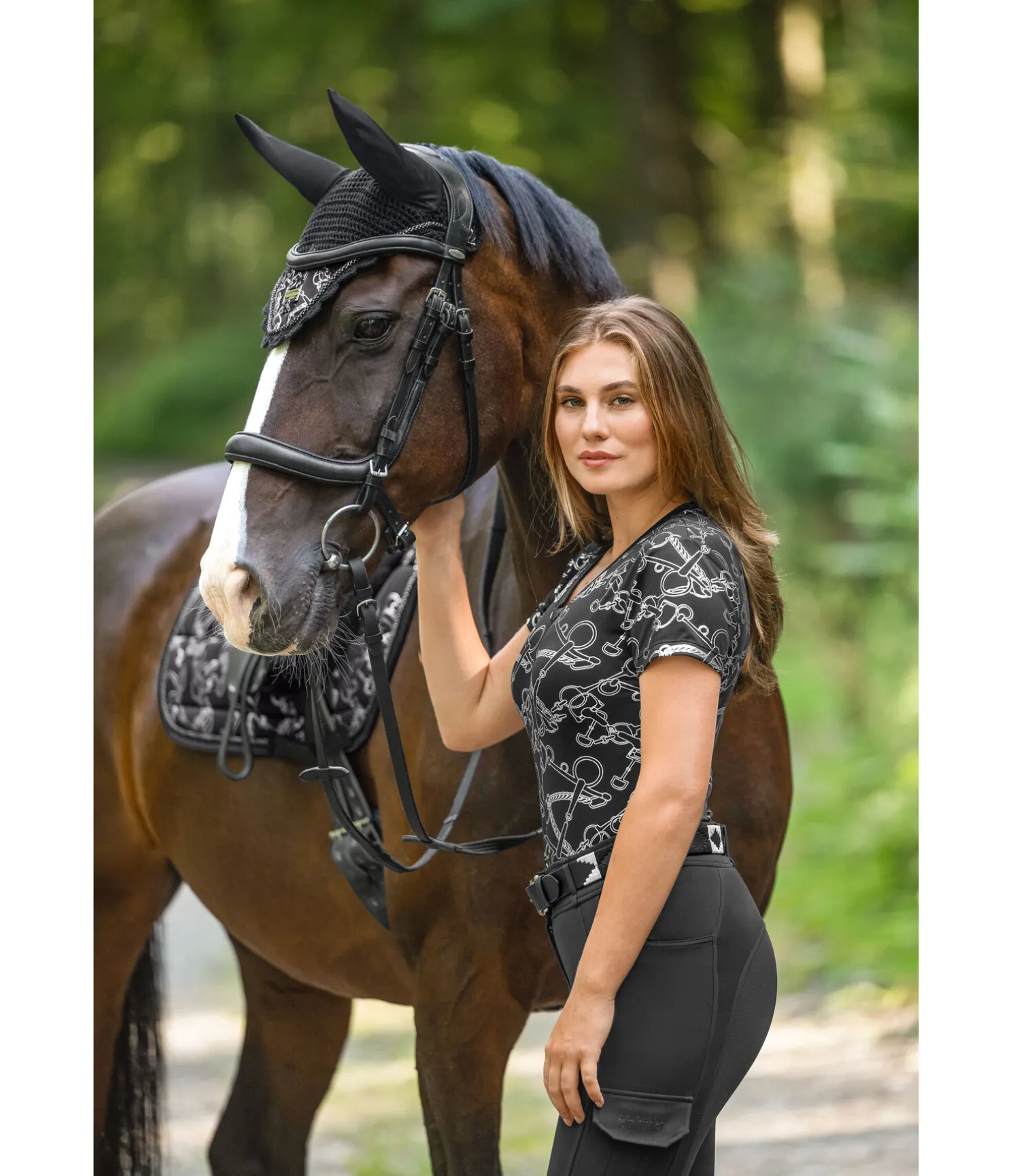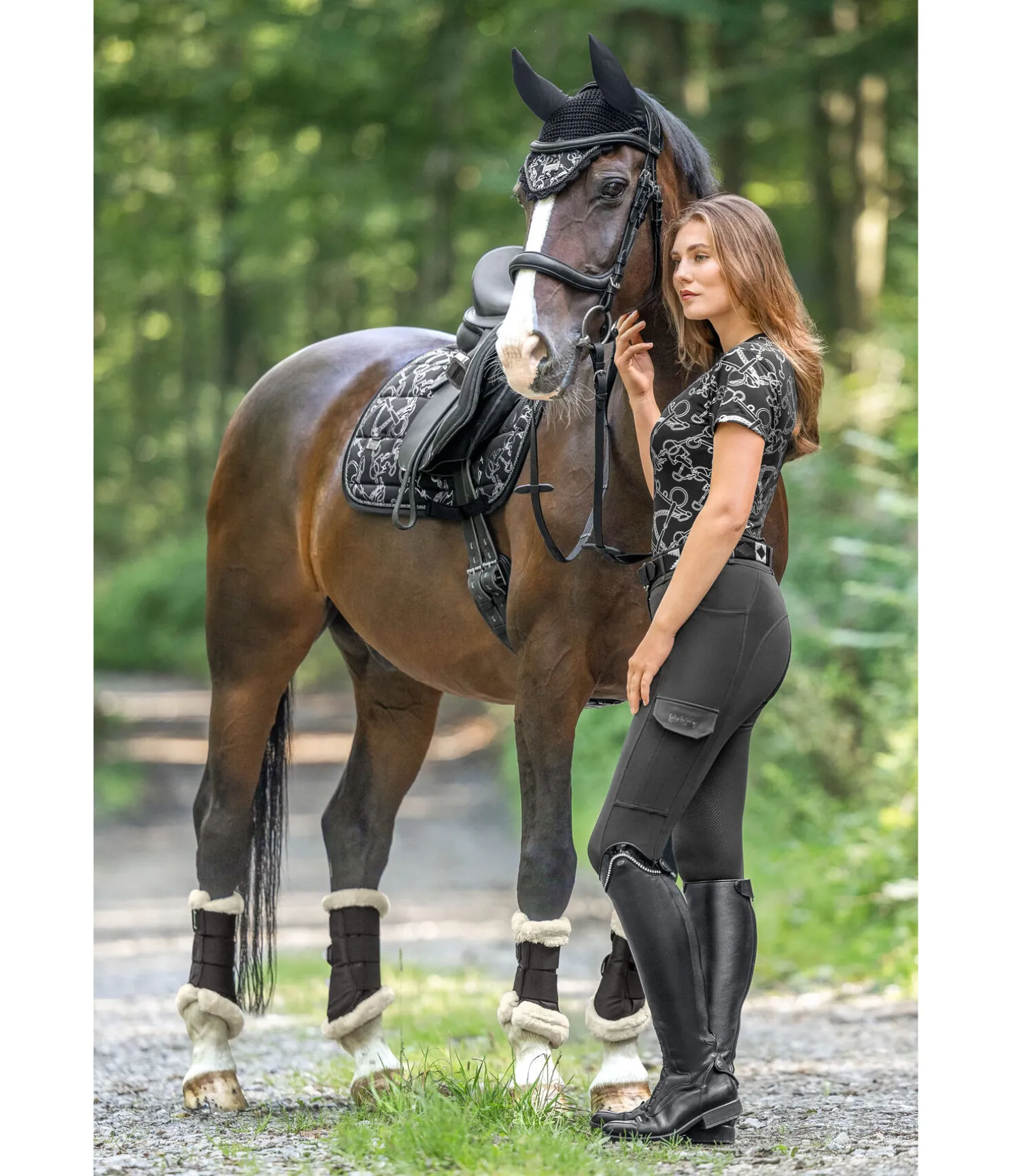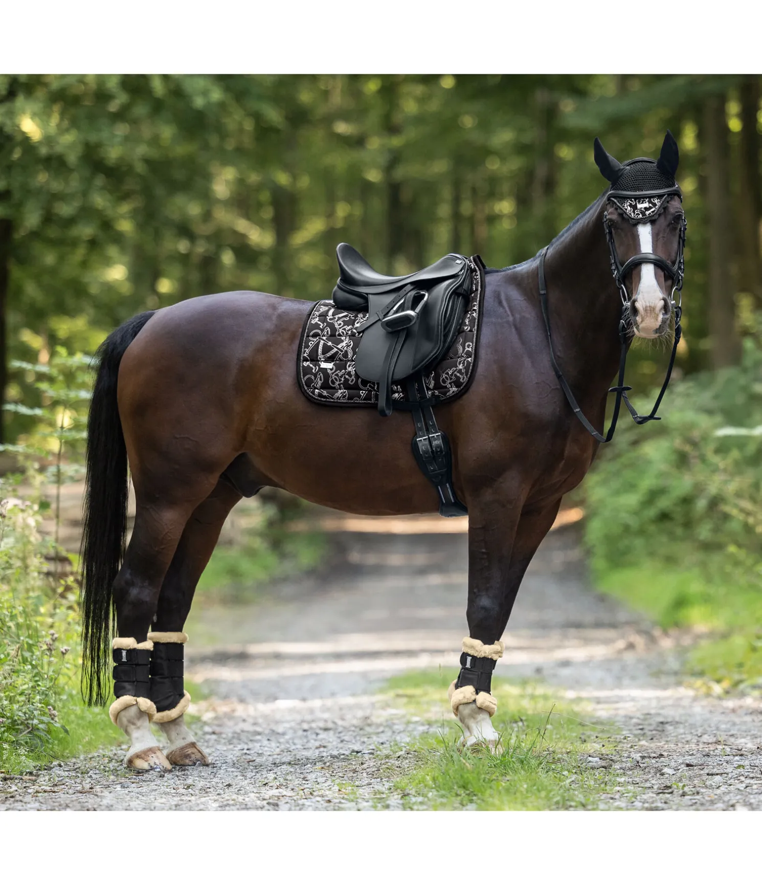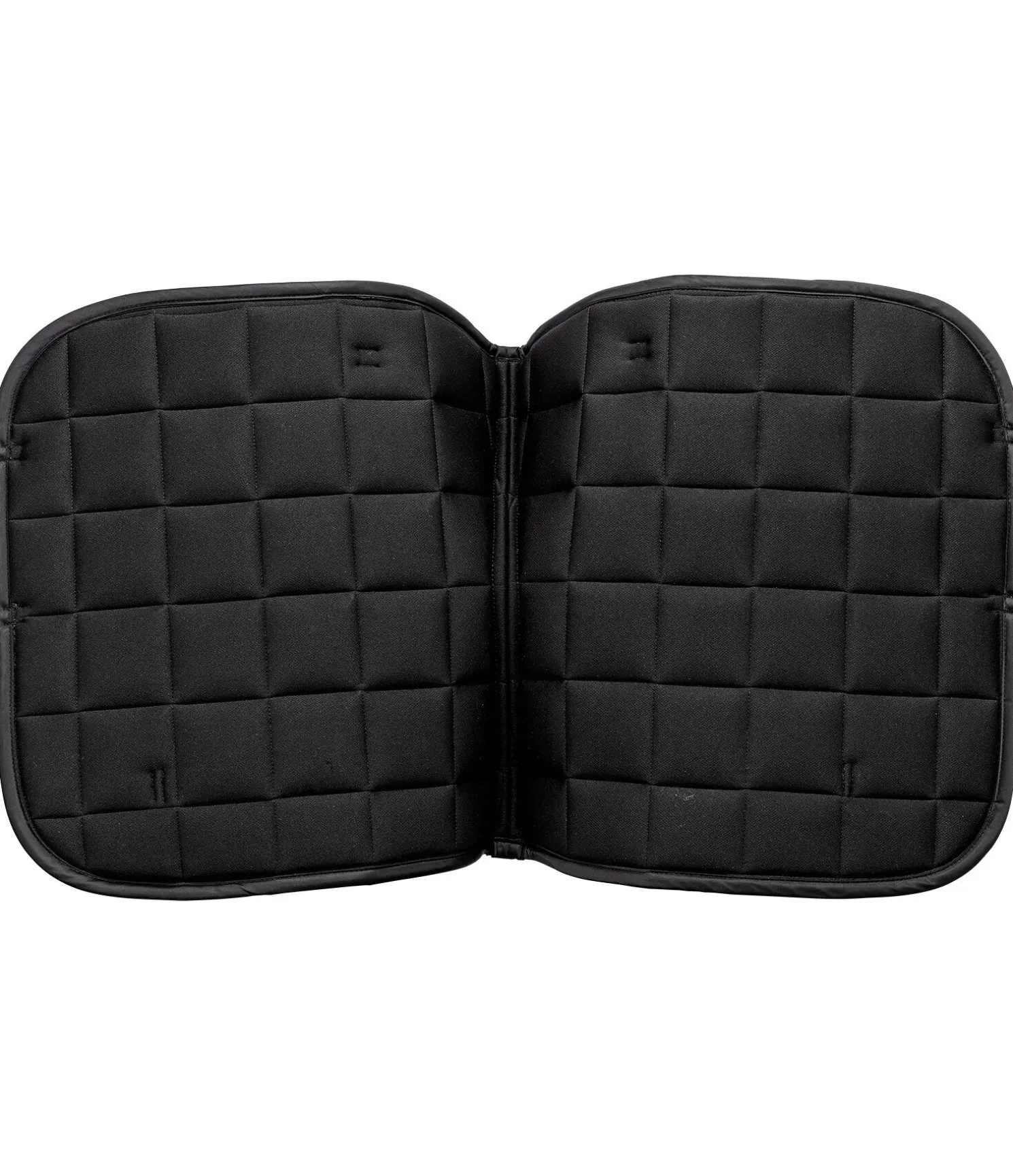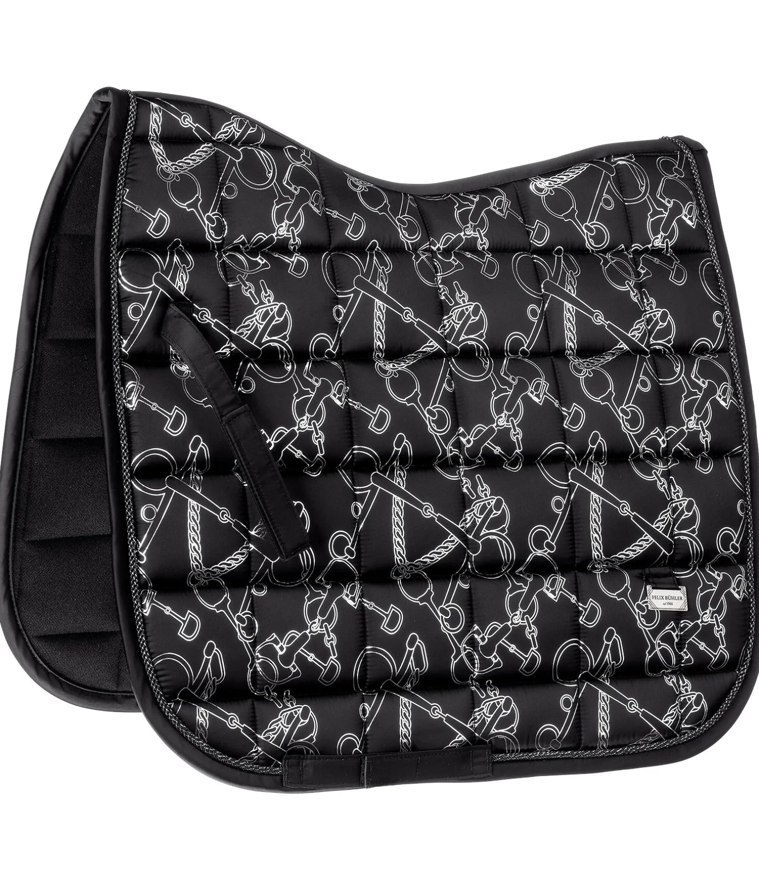 Élégant tapis de selle brillant en matière lisse et imprimé métallique all-over avec motif mors tendance. Cordon décoratif scintillant et plaque logo métallique de chaque côté. Passants de sangle et contre-sanglons avec patte auto-agrippante pratique. Dessous en Air mesh respirant et absorbant l’humidité. Matière : 100 % polyester. PDR : longueur de dos 55 cm, hauteur 49 cm DR : longueur de dos 58 cm, hauteur 52 cm VS : longueur de dos 60 cm, hauteur 50 cm