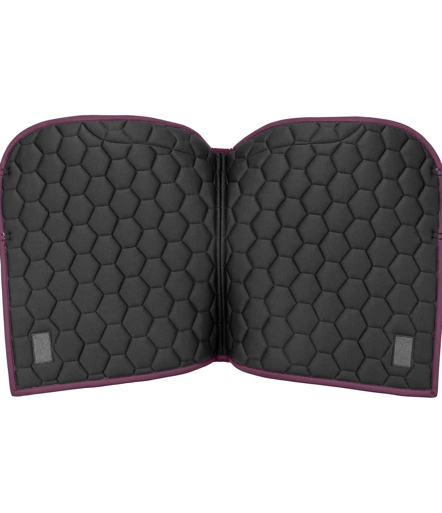 Tapis de selle avec rembourrage à l’avant permettant de garder la selle en place sans passants de contre-sanglons. Coupe sportive avec angle droit et surpiqûre en losanges. Dessus en matière lisse anti-salissures, cordon décoratif de couleur assortie et plaque logo métallique classique. Passants de sangle avec patte auto-agrippante pratique. Dessous en Air mesh respirant et absorbant l’humidité. 100 % polyester.