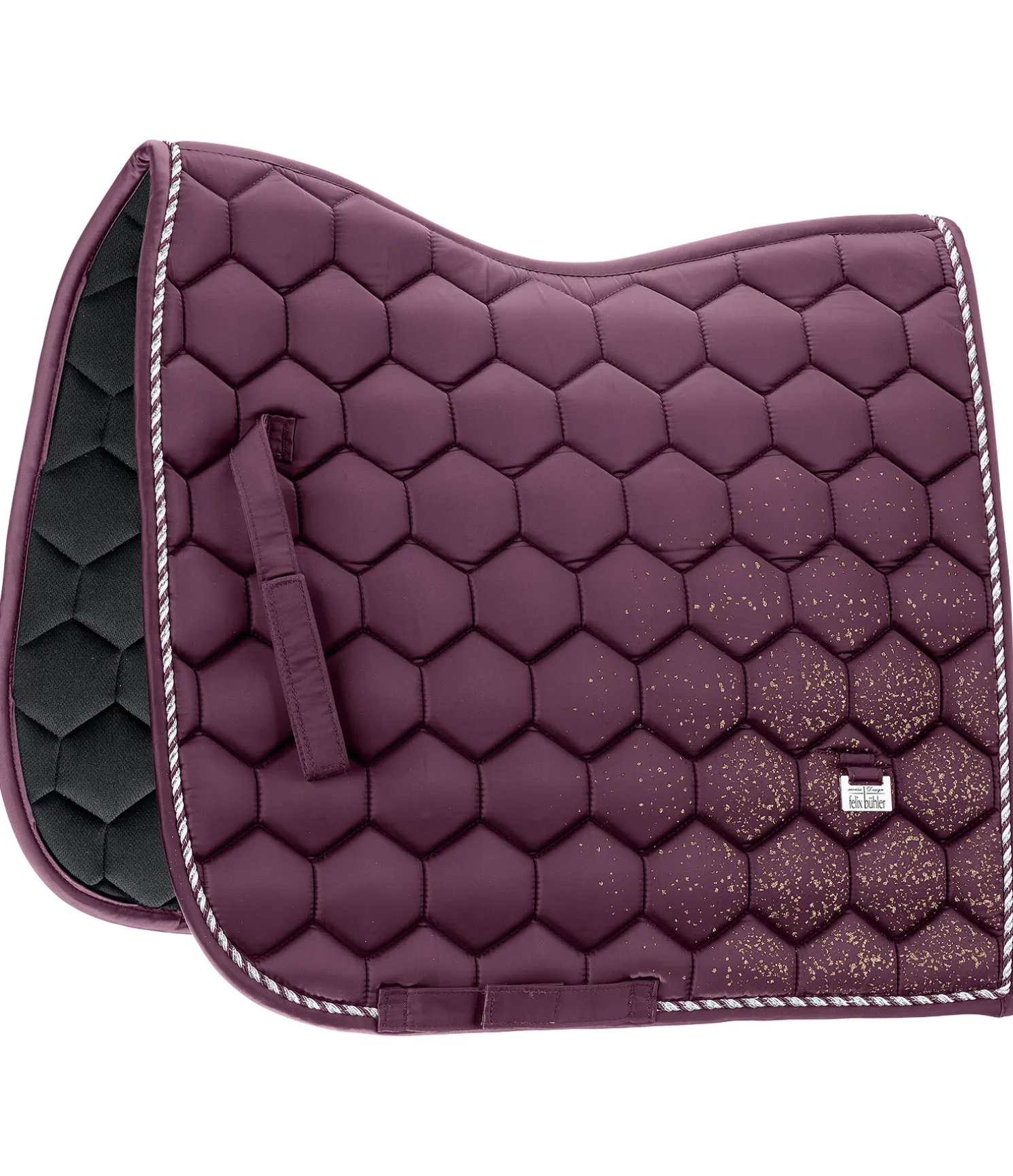 Tapis de selle de forme carrée. Satiné et orné de fragments scintillants, d’un triple cordon décoratif et d’une petite plaque métallique avec logo gravé. Plaque argentée en S, dorée en CO et rose-doré en NV. Passants de sangle et de contre-sanglons avec patte auto-agrippante pratique. Dessous en Air mesh respirant et absorbant l’humidité. 100 % polyester.
