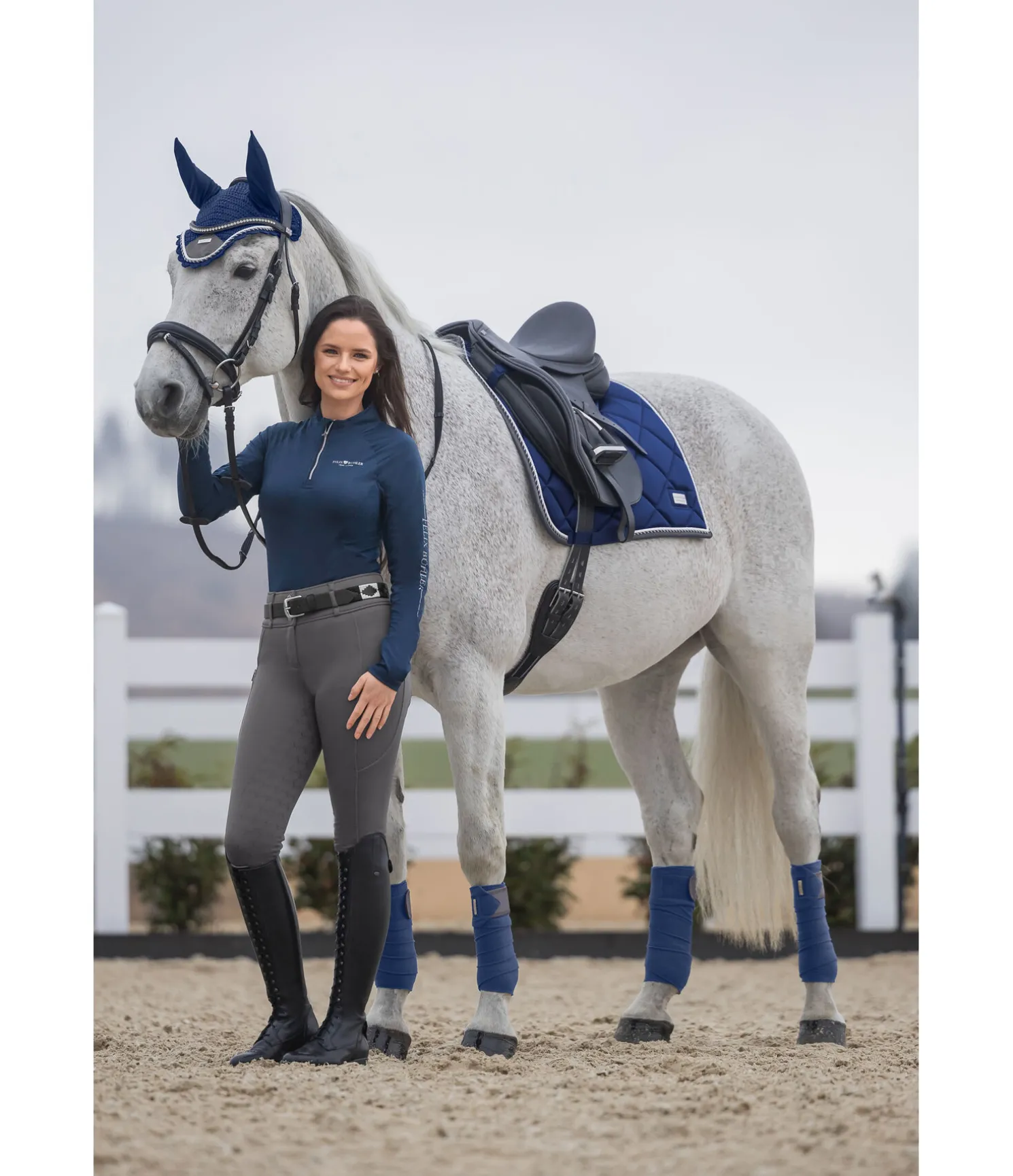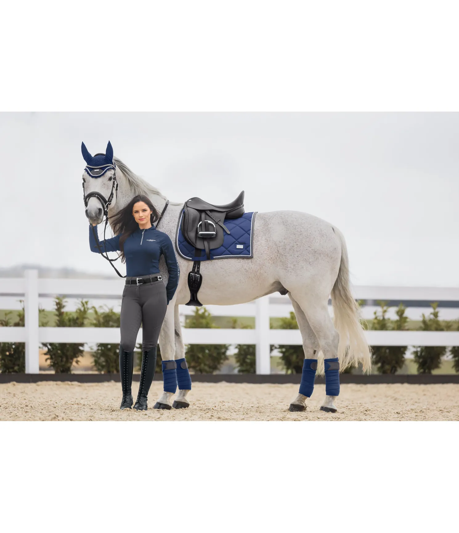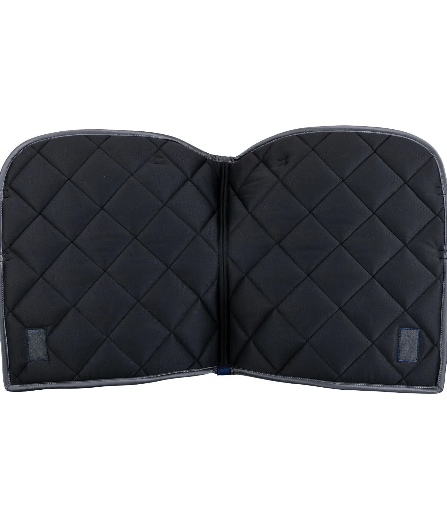 Tapis de selle de forme carrée. Petite plaque argentée avec logo. Tissu satiné. Cordons décoratifs de couleur assortie. Passants de sangle et de contre-sanglons avec patte auto-agrippante pratique. Dessous en Air mesh respirant et absorbant l’humidité. 100 % polyester.