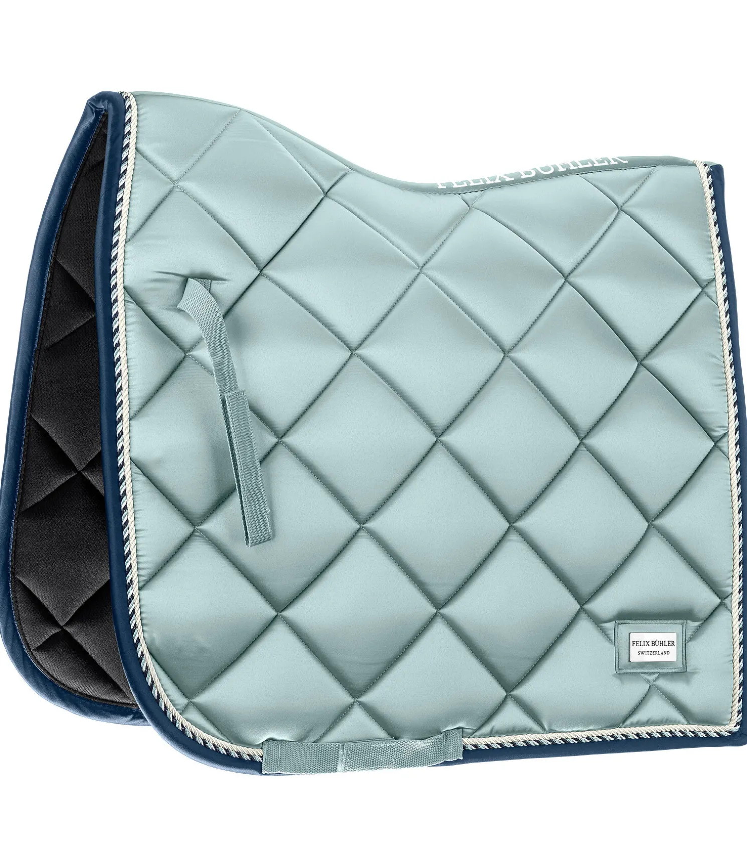 Tapis de selle de forme carrée. Petite plaque argentée avec logo. Tissu satiné. Cordons décoratifs de couleur assortie. Passants de sangle et de contre-sanglons avec patte auto-agrippante pratique. Dessous en Air mesh respirant et absorbant l’humidité. 100 % polyester.