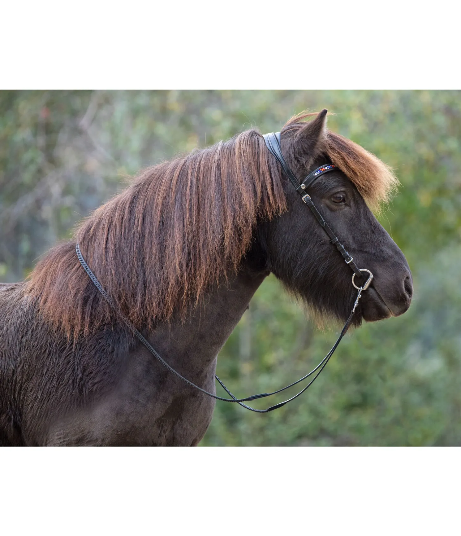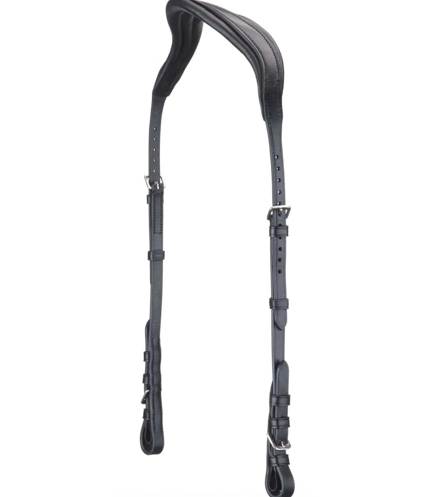 Têtière anatomique en cuir gras. Doublure moelleuse au niveau de la nuque. Les boucles élastiquées pour le mors assurent une position stable dans la bouche du cheval et soulagent la nuque.