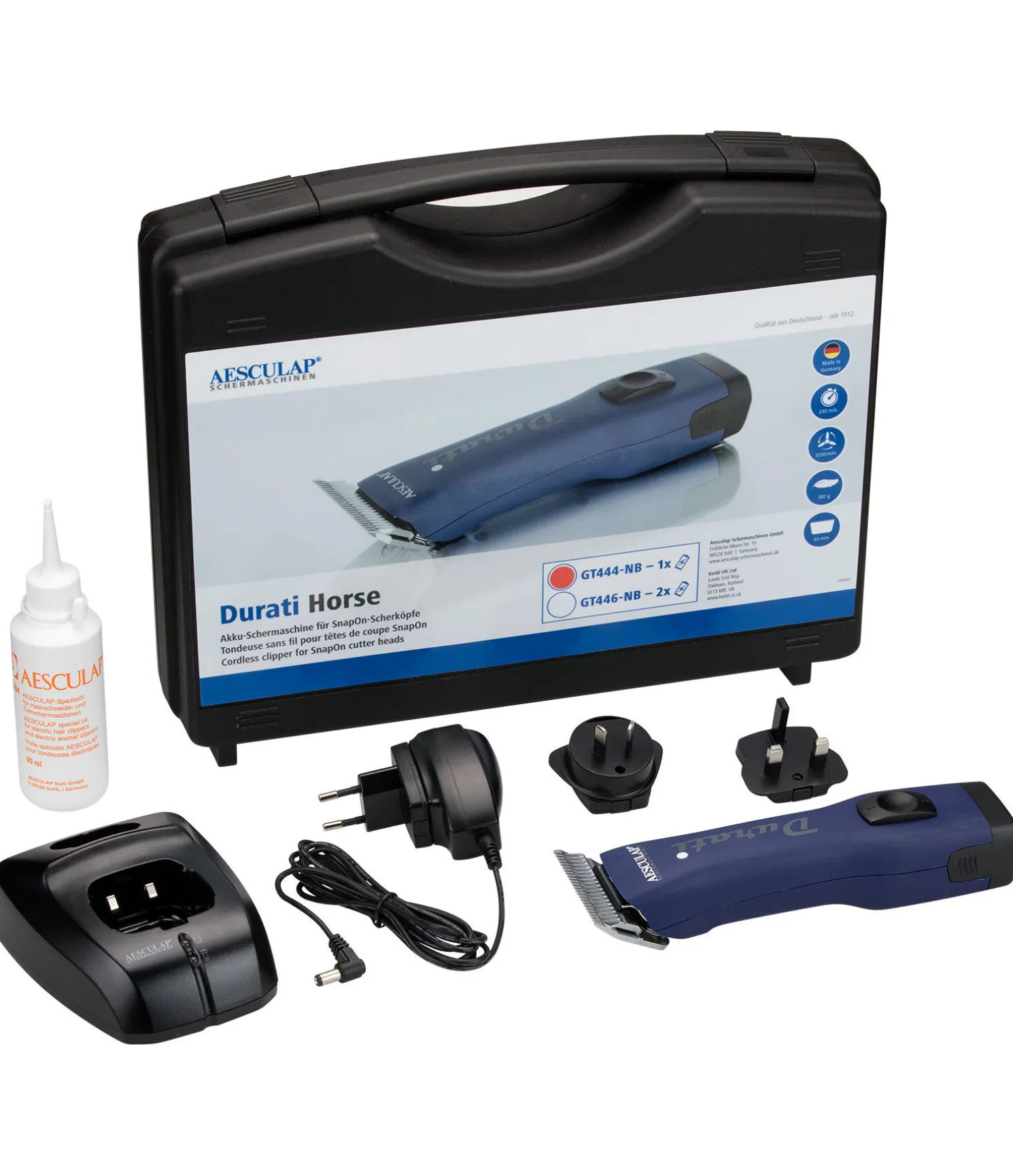 Vitesse de tonte élevée pour une coupe optimale (3 300 mouvements par minute). Batterie puissante avec technologie lithium-ion. Travail peu fatigant grâce au poids très faible de 380 g. Station de charge avec compartiment pour la machine et la batterie. Avec tête de coupe large (2,4 mm). Durée de tonte : 240 min.