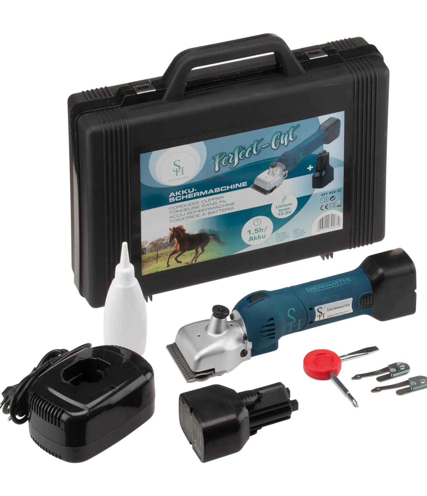 Rapport qualité-prix exceptionnel ! Elle est livrée avec deux batteries lithium-ion de 10,8 volts qui permettent de tondre sans interruption grâce à un temps de travail et de charge optimisés. La tondeuse est équipée de nos lames de tondeuse SHOWMASTER LongLasting (Made in Germany). Grâce à leur forme optimisée, elles facilitent la tonte pour un meilleur résultat. La tondeuse a des caractéristiques ergonomiques tout à fait remarquables : le boîtier particulièrement bien fini et le centre de gravité équilibré empêchent de se fatiguer trop vite. La circonférence du boîtier en plastique permet également aux petites mains de bien tenirr la tondeuse, ce qui constitue un plus en matière de sécurité. Tondeuse avec de superbes caractéristiques polyvalentes, dotée d’excellentes propriétés de manipulation. Environ 76 dB. Temps de travail et de charge optimal (env. 1,5 h) pour une tonte sans interruption équipée de lames de tondeuse SHOWMASTER LongLasting « Made in Germany ». Coque de boîtier assurant une parfaite prise en main pour un travail sans fatigue. Le centre de gravité équilibré permet de tondre en ménageant ses forces.
