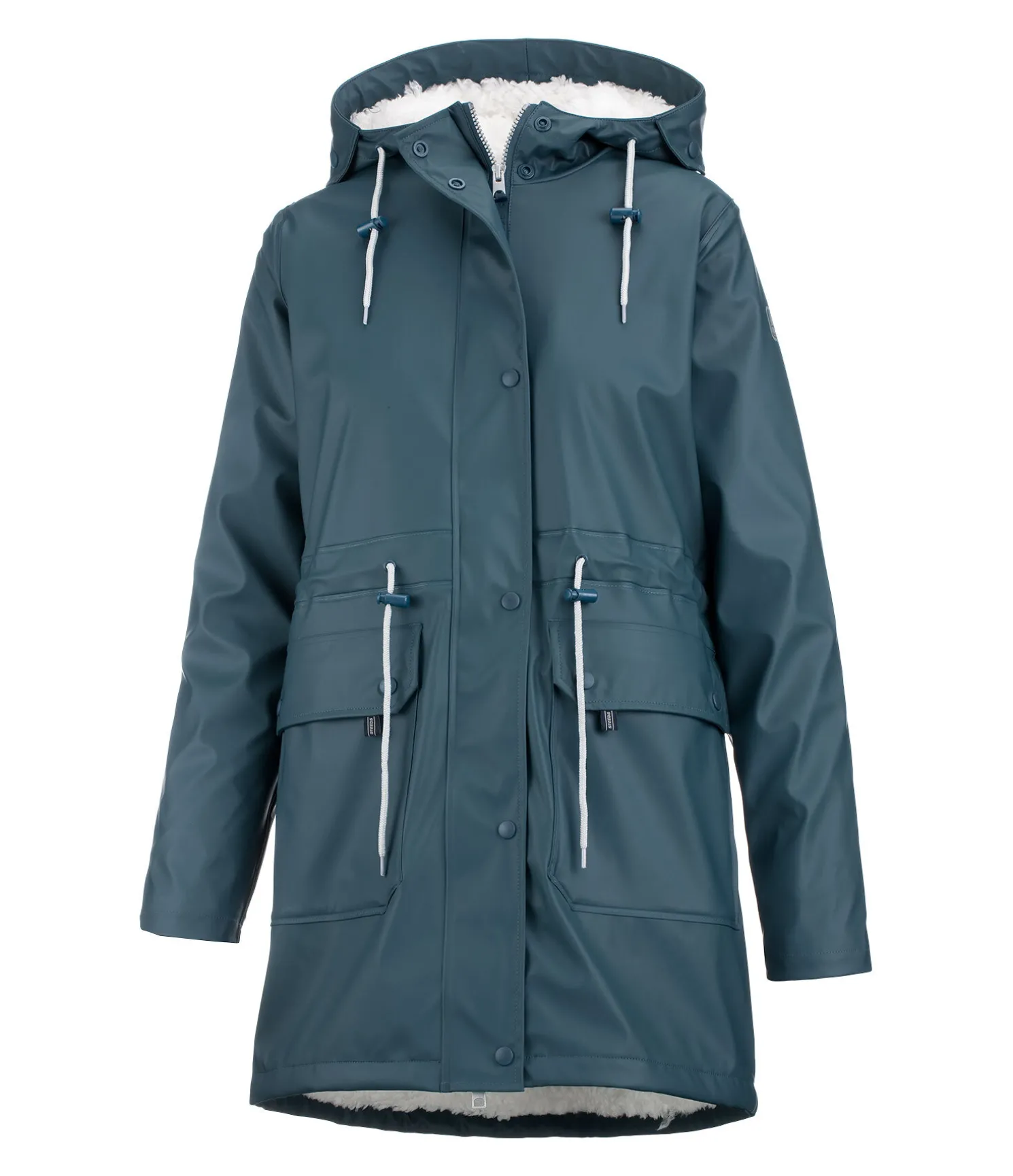 Veste d’équitation de pluie douce et chaude avec doublure intégrale en polaire Teddy. Large capuche réglable en cas de forte pluie. Imperméable et coupe-vent. Fermeture à glissière double sens dissimulée. 2 poches latérales à rabat avec boutons-pression. Taille ajustable par cordon de serrage. 1 fente cavalière avec boutons-pression à l’arrière. Imprimé STEEDS sur la manche et la capuche. 100 % polyuréthane, doublure en polaire Teddy 100 % polyester.
