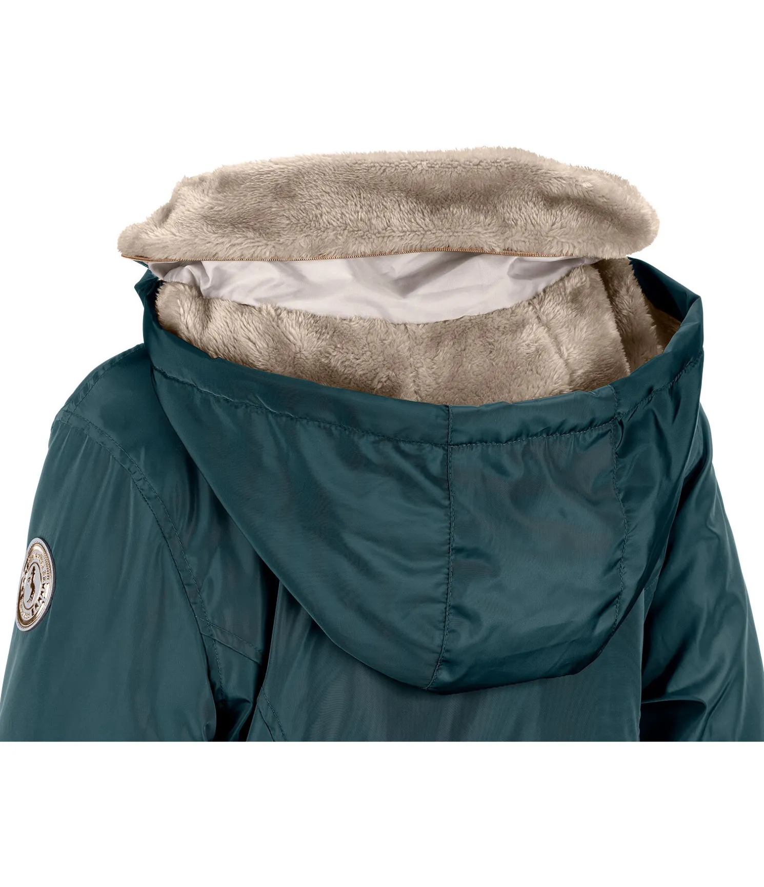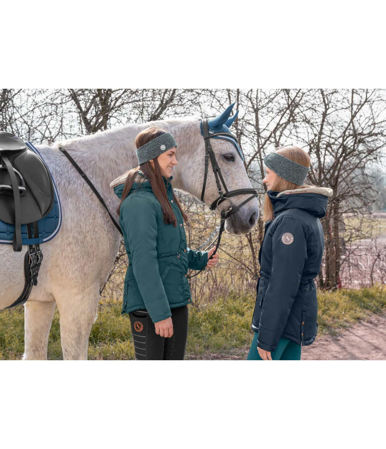Veste d’équitation d’hiver technique, déperlante et coupe-vent. Matière respirante et chaude. Large col et capuche amovible doublés en polaire Teddy douce. Capuche rétractable dans le large col. Garnissage imitation duvet. Fermeture à glissière double sens dissimulée avec protège-menton. Deux poches zippées latérales dissimulées et une poche intérieure. Taille ajustable. Deux fentes cavalières avec boutons-pression à l’arrière. Badge logo Felix Bühler sur la manche. Fermeture à glissière et boutons-pression rose doré. 100 % polyester.
