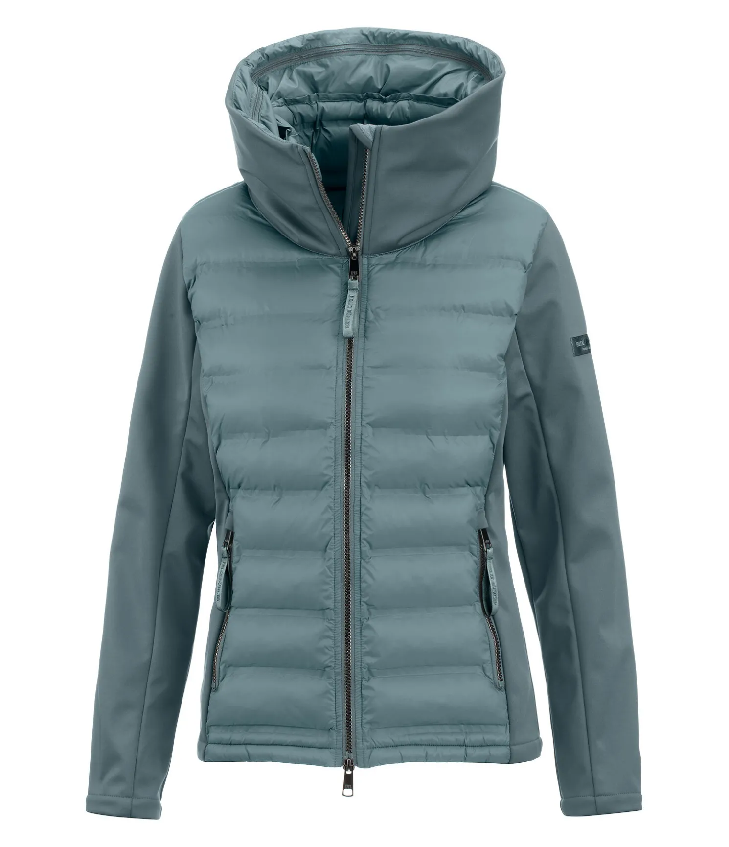 Superbe combinaison de softshell extensible et de nylon avec un garnissage très doux en imitation duvet devant et derrière. Coupe-vent. Double col et capuche rembourrée repliable dans le large col extérieur par fermeture à glissière. Coutures thermosoudées, fermeture à glissière double sens avec sous-patte et protège-menton, 2 poches zippées devant. Logo élaboré sur la manche et le col. Avant, dos, col intérieur et capuche 100 % nylon, matière softshell 92 % polyester, 8 % élasthanne.