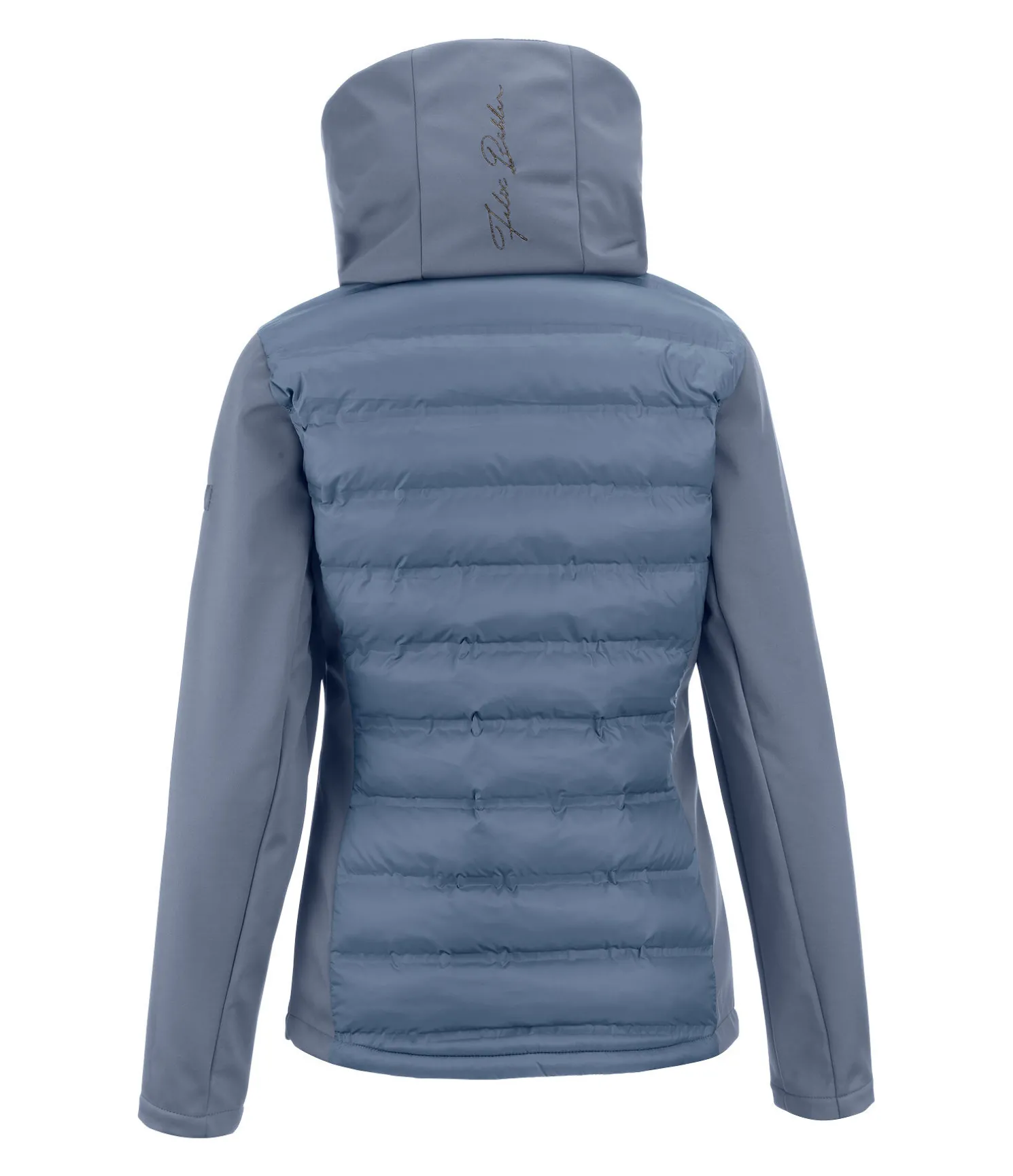 Superbe combinaison de softshell extensible et de nylon avec un garnissage très doux en imitation duvet devant et derrière. Coupe-vent. Double col et capuche rembourrée repliable dans le large col extérieur par fermeture à glissière. Coutures thermosoudées, fermeture à glissière double sens avec sous-patte et protège-menton, 2 poches zippées devant. Logo élaboré sur la manche et le col. Avant, dos, col intérieur et capuche 100 % nylon, matière softshell 92 % polyester, 8 % élasthanne.