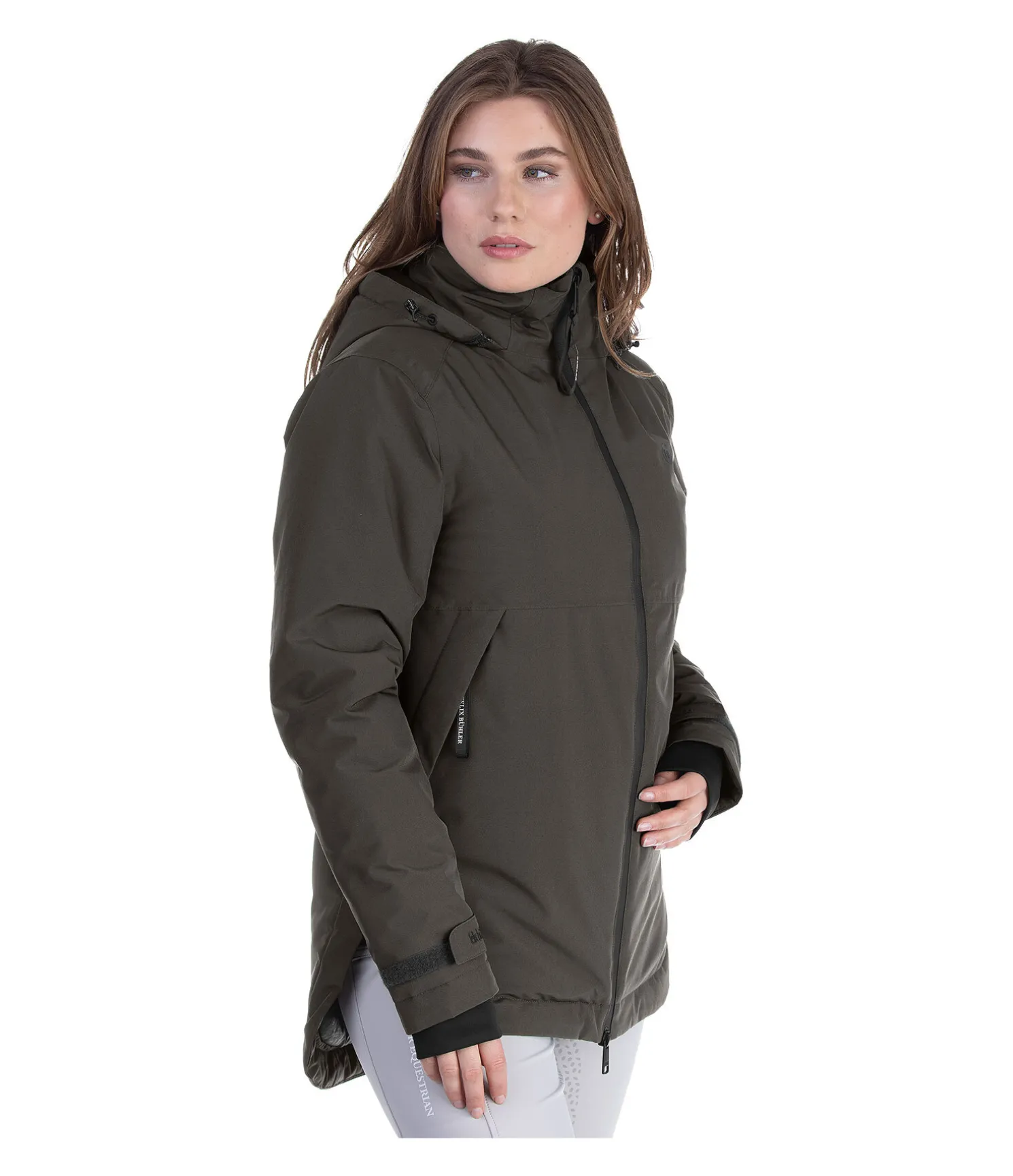 Veste d’équitation avec doublure chaude. Matière respirante, imperméable (10.000 mm) et coupe-vent. Col montant. Capuche amovible et réglable. Bouton-pression pour fixer la capuche dans le dos. Fermeture à glissière double sens étanche avec sous-patte. 2 poches avant zippées et dissimulées. 1 poche intérieure zippée. Bas des manches ajustable, élastiqué et coupe-vent. Bouton-pression sur chaque côté. Coupe plus longue à l’arrière. Imprimé Felix Bühler sur les manches, la capuche et les poignets. 100 % polyester.