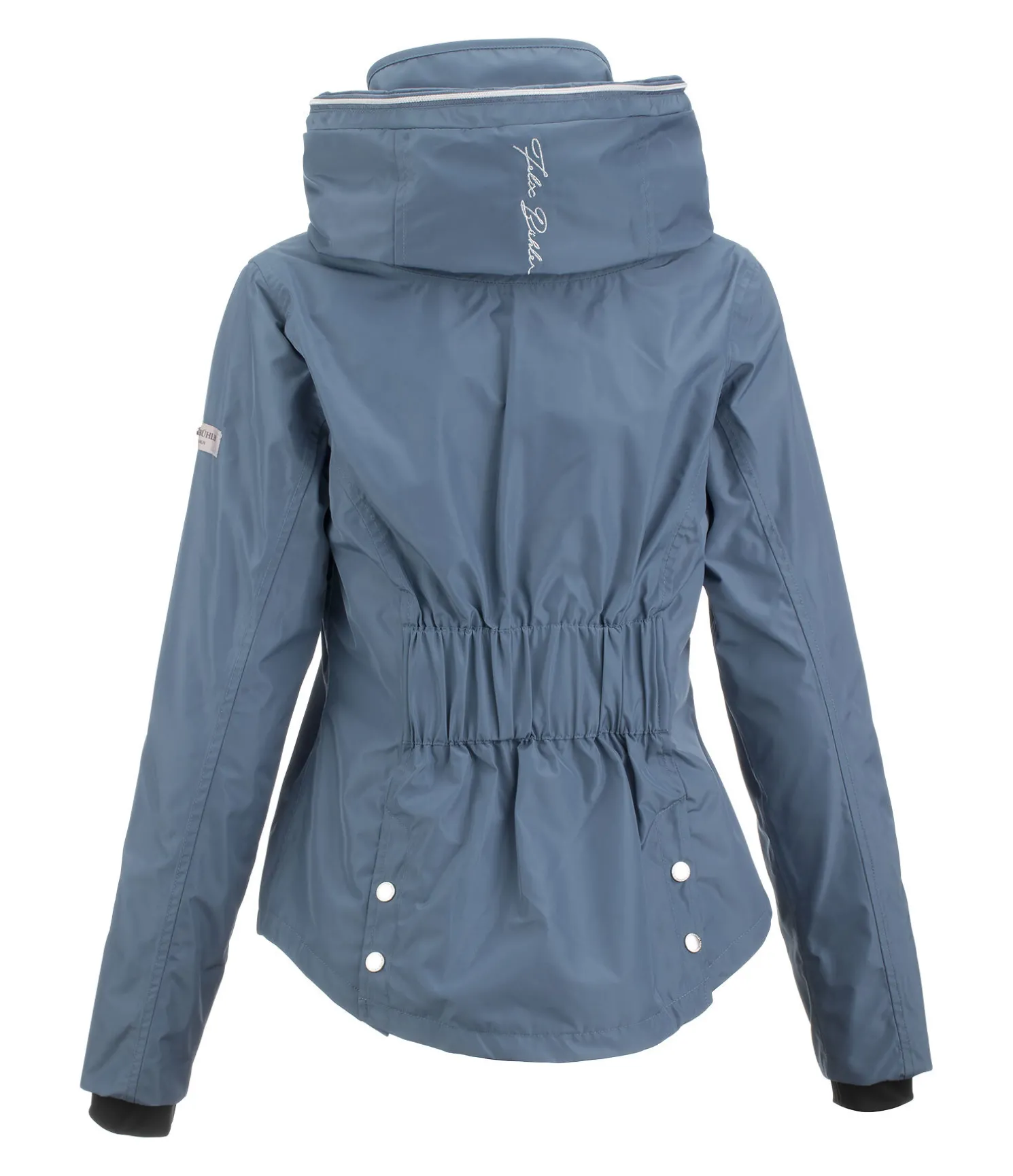 Élégante veste d’équitation technique à l’ajustement optimal. Imperméable (3.000 mm), coupe-vent et respirante. Double col. La capuche peut se ranger dans le vaste col. 2 fentes cavalières avec boutons-pression à l’arrière et large élastique dans le dos pour marquer la taille. Fermeture à glissière double sens avec sous-patte et protège-menton, 2 poches zippées à l’avant, poignets élastiqués. 100 % polyester.