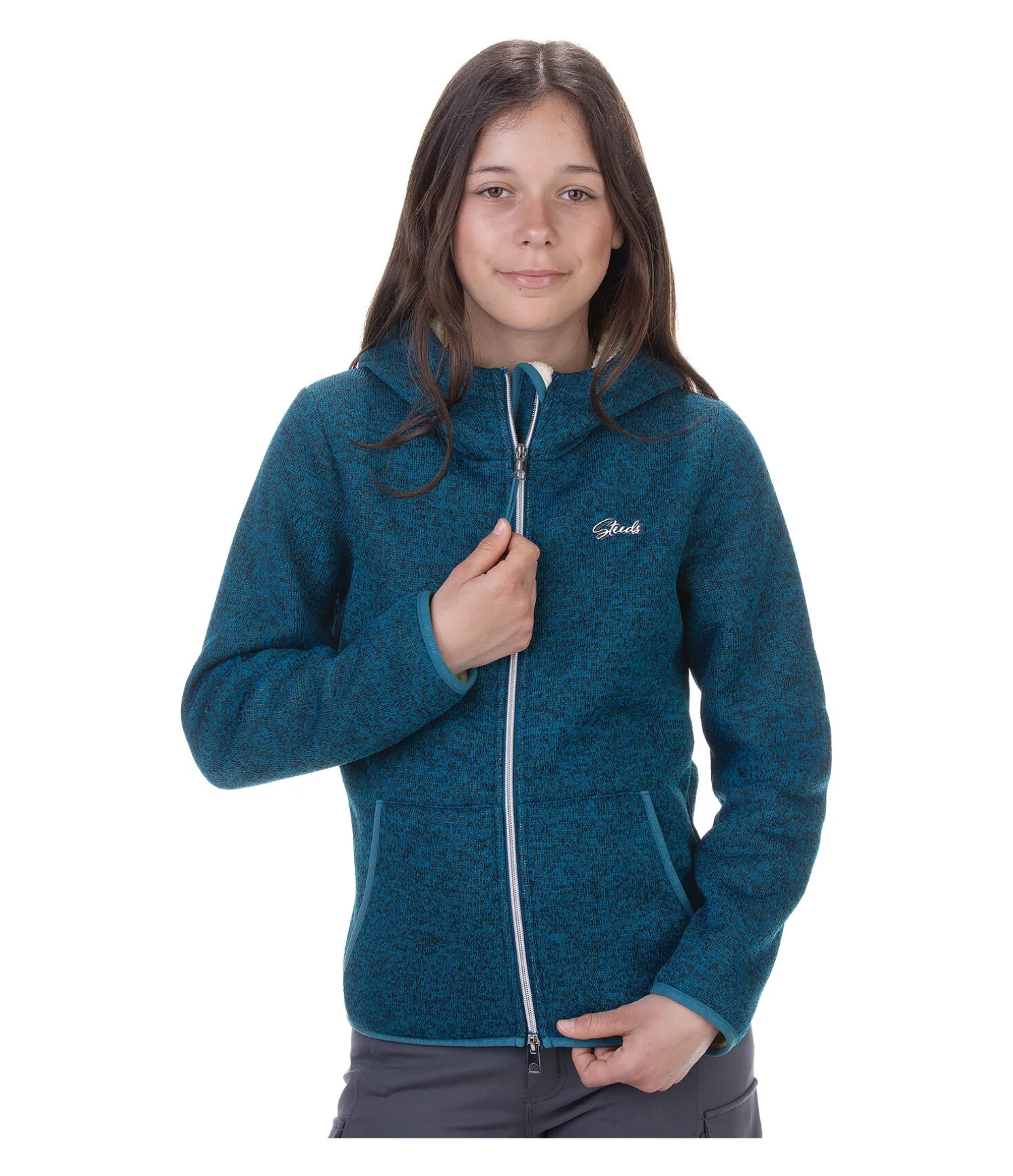 Jolie veste en tricot polaire. Aspect chiné. Logo discret brodé sur la poitrine. Intérieur et capuche doublés en polaire Teddy douce de couleur contrastante. Fermeture à glissière bidirectionnelle avec protège-menton. Deux poches latérales. 100 % polyester.