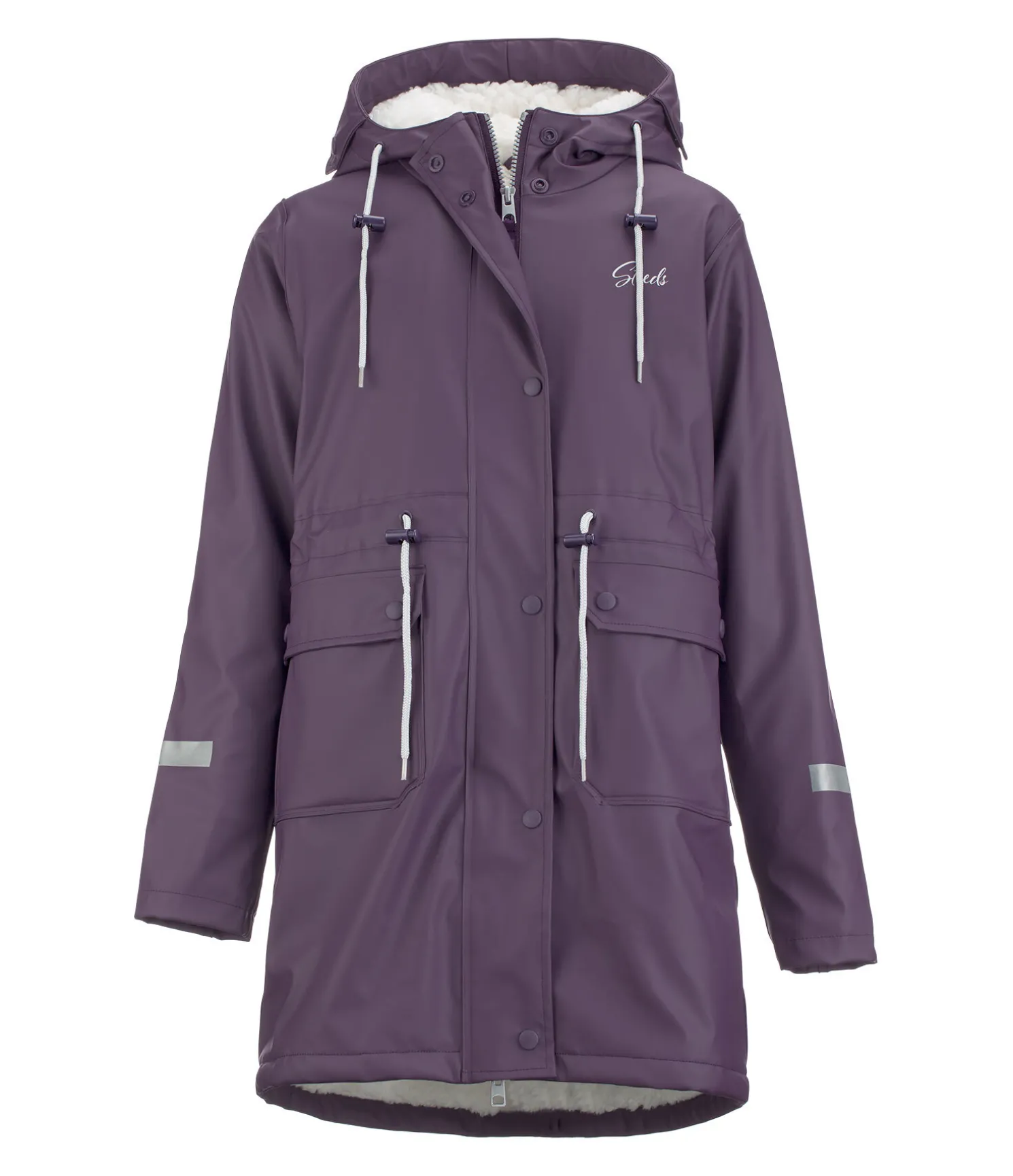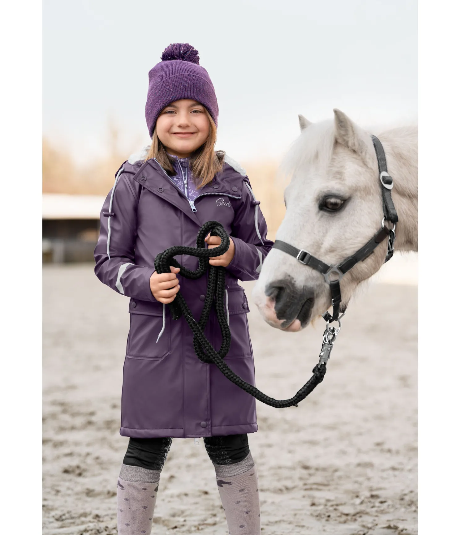 Veste hiver de pluie chaude et douillette pour enfant avec doublure intégrale en polaire Teddy. Avec large capuche réglable qui peut être agrandie en cas de fortes pluies. Imperméable et coupe-vent. Fermeture à glissière double sens dissimulée, 2 poches à rabat avec boutons pression devant, cordon de serrage à la taille, 1 fente cavalière avec boutons pression à l’arrière et imprimé réfléchissant sur la manche. Imprimés STEEDS sur la manche et la capuche. 100 % polyuréthane, doublure en polaire Teddy 100 % polyester.