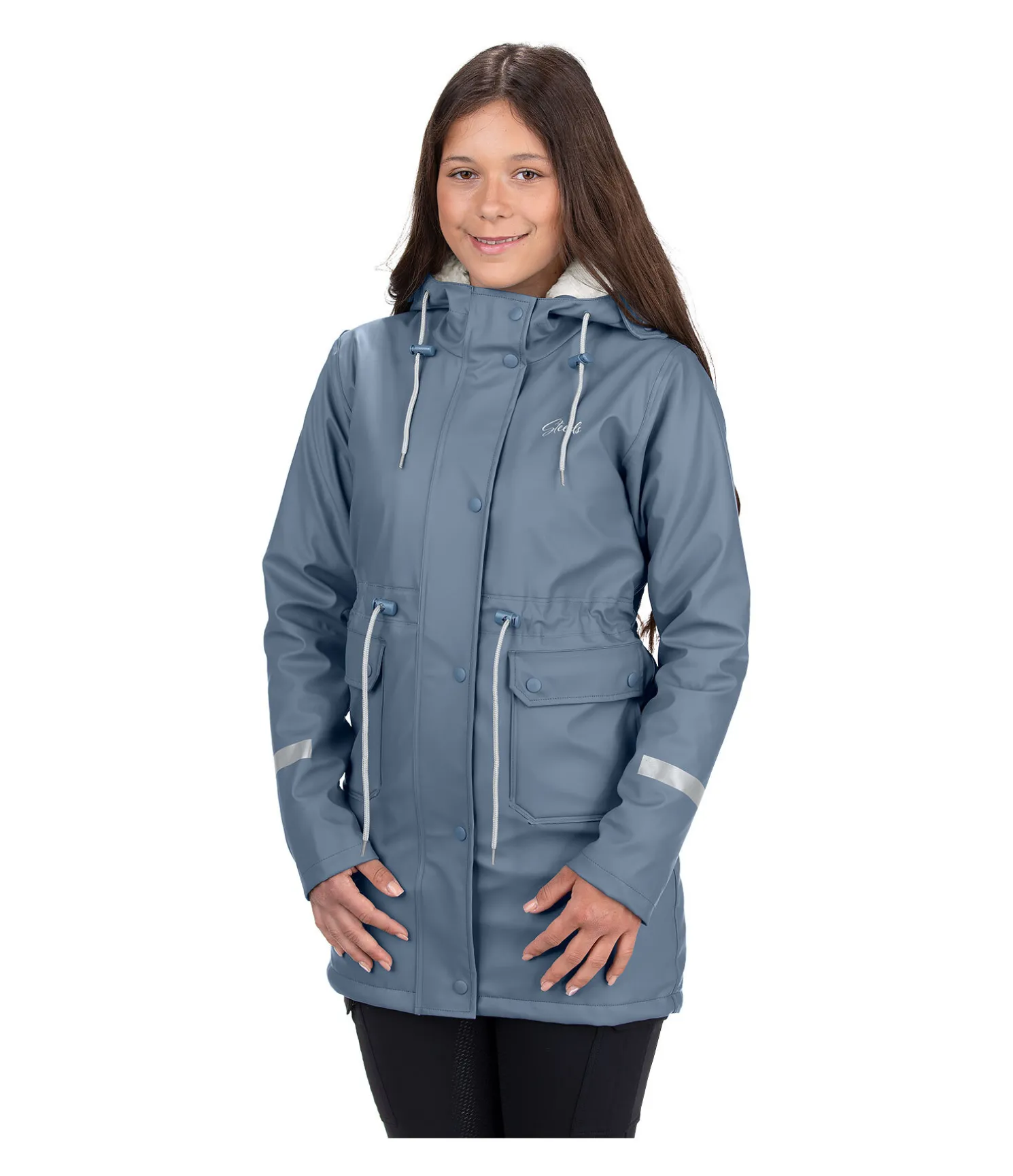 Veste hiver de pluie chaude et douillette pour enfant avec doublure intégrale en polaire Teddy. Avec large capuche réglable qui peut être agrandie en cas de fortes pluies. Imperméable et coupe-vent. Fermeture à glissière double sens dissimulée, 2 poches à rabat avec boutons pression devant, cordon de serrage à la taille, 1 fente cavalière avec boutons pression à l’arrière et imprimé réfléchissant sur la manche. Imprimés STEEDS sur la manche et la capuche. 100 % polyuréthane, doublure en polaire Teddy 100 % polyester.