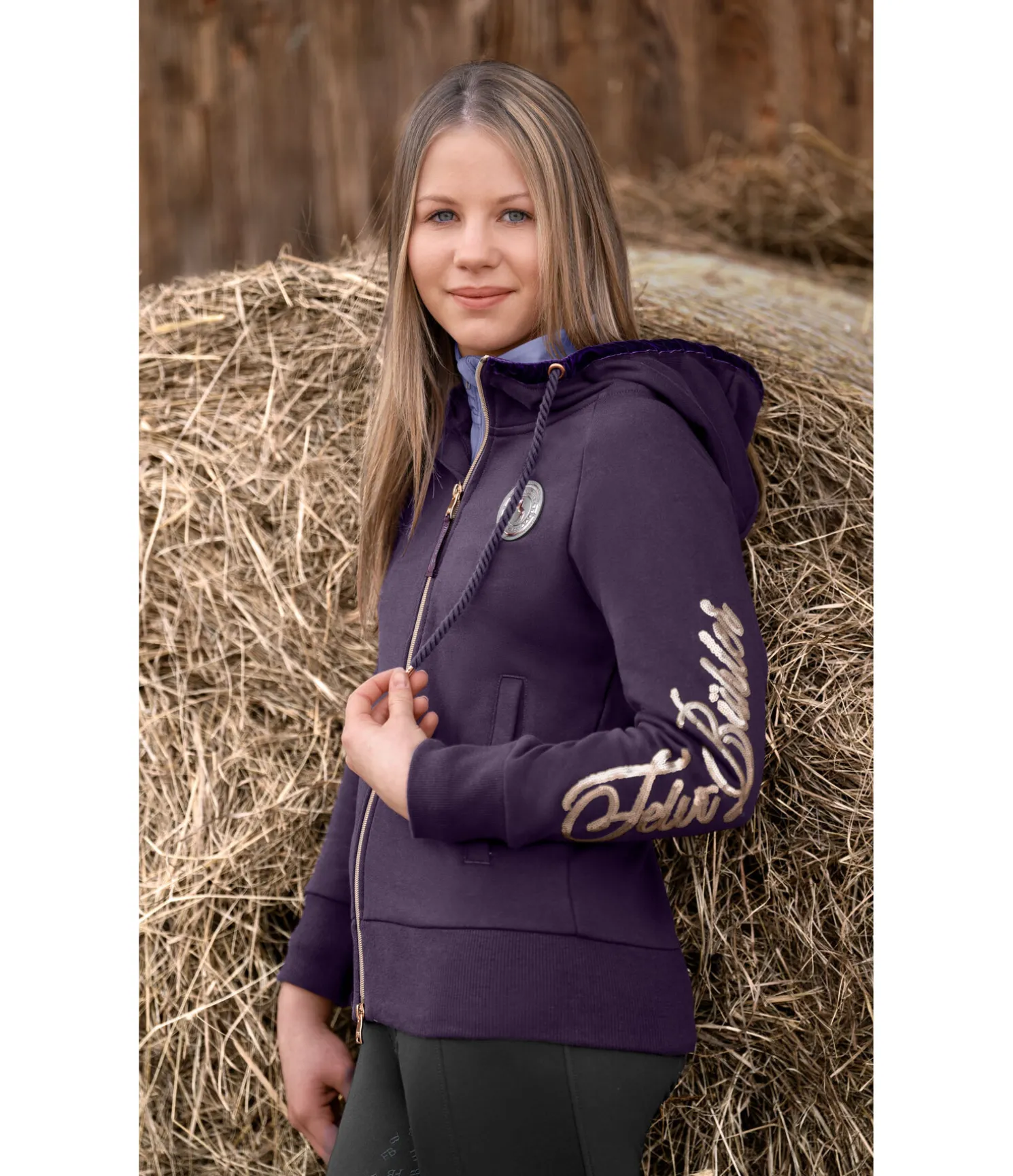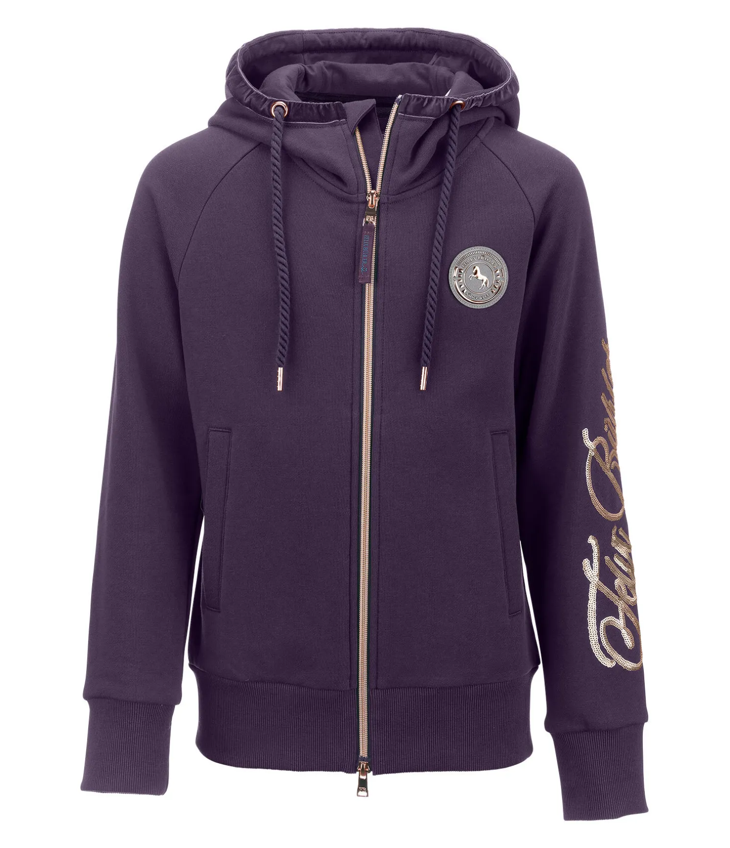 Veste sweat sportswear en coton stretch. Badge Felix Bühler sur la poitrine et inscription Felix Bühler rose doré scintillante. Capuche réglable ornée d’un ruban de velours et d’un cordon torsadé. Intérieur molletonné. Fermeture à glissière double sens rose doré avec sous-patte et protège-menton. Deux poches latérales. Bord-côte sur le bas des manches et la taille. 60 % coton, 40 % polyester.