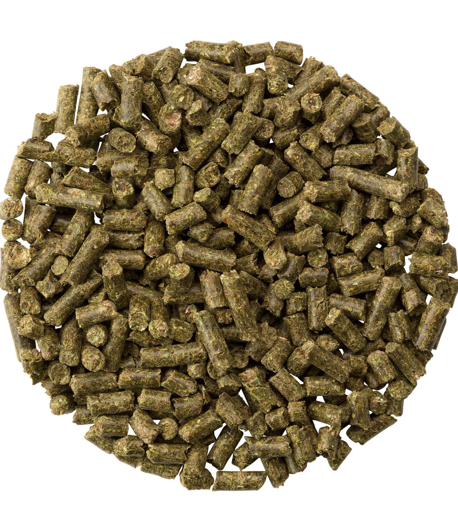 Composition : herbe (séchée et moulue), marc de pomme, tourteau de lin, levure de bière (Saccharomyces Cerevisiae).