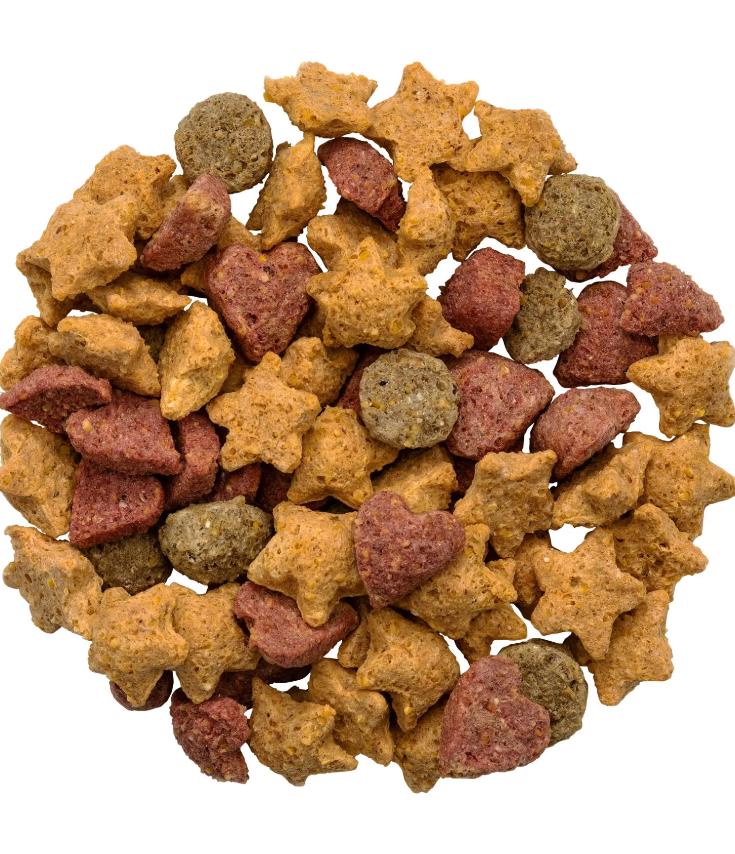 Fantastique assortiment de mini-friandises de trois saveurs différentes, afin d’apporter un peu de variété dans les récompenses de ton chouchou. Avec d’adorables étoiles à la mangue, des croustillants à la pomme et de délicieux petits coeurs à la betterave.