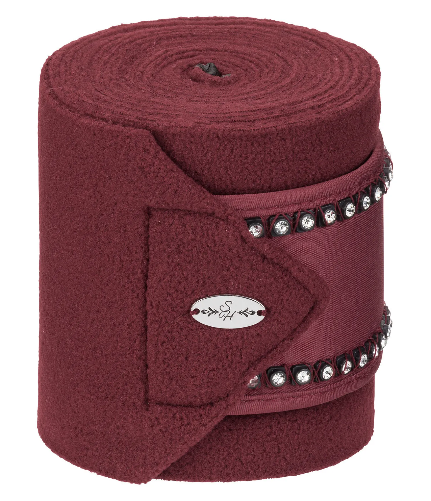 Bandes de polo en polaire. Passepoil avec strass sur la fermeture des bandes. Patte auto-agrippante pour un maintien sûr. 100 % polyester. F (cheval) : 300 x 10 cm, P (poney) : 200 x 8 cm. Vendues par lot de 4.