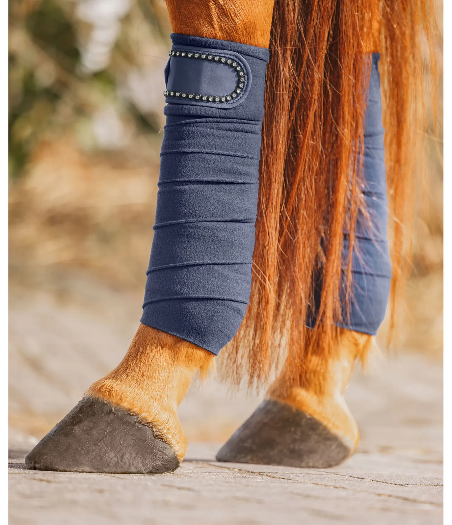 Bandes de polo en polaire. Passepoil avec strass sur la fermeture des bandes. Patte auto-agrippante pour un maintien sûr. 100 % polyester. F (cheval) : 300 x 10 cm, P (poney) : 200 x 8 cm. Vendues par lot de 4.