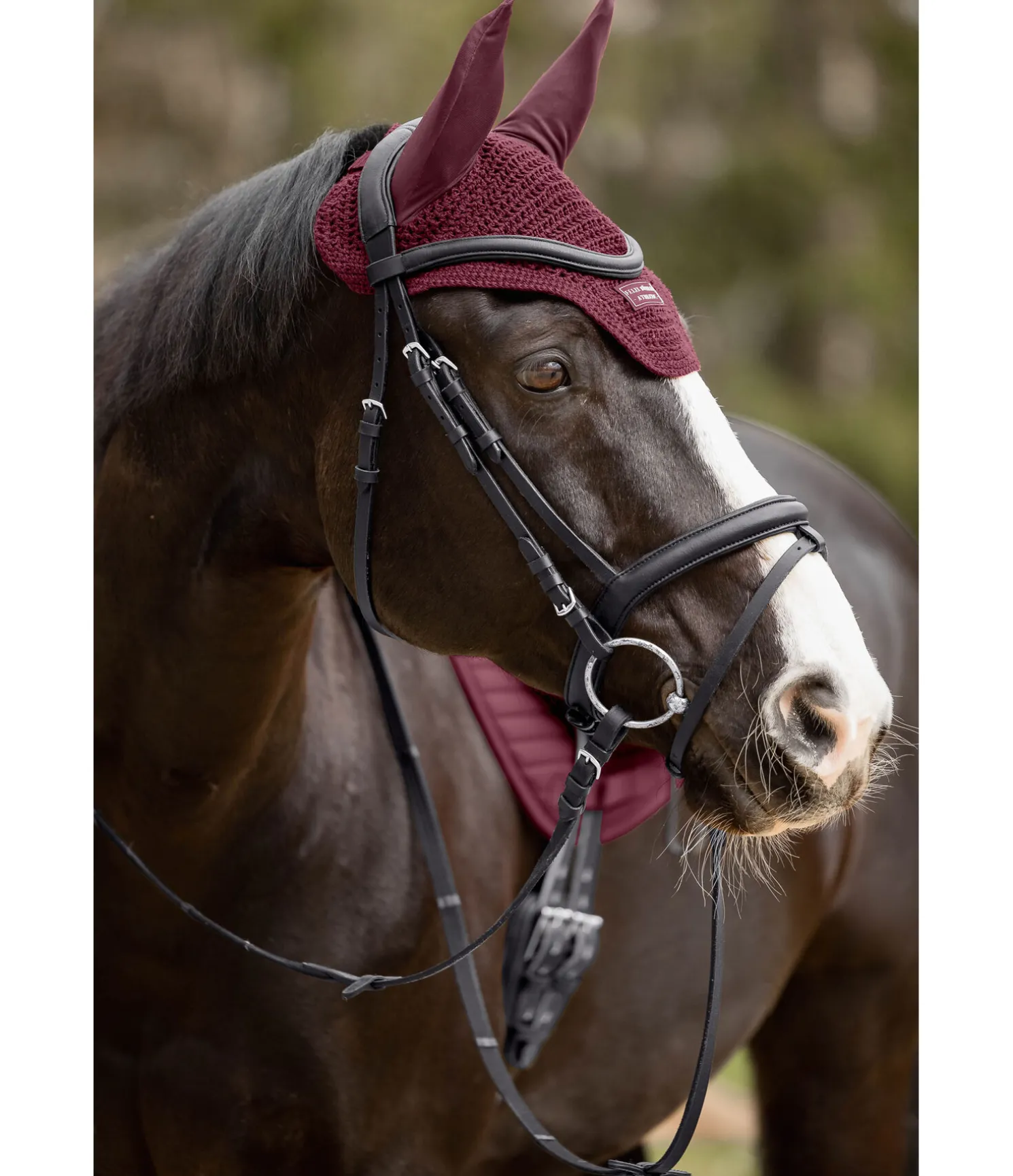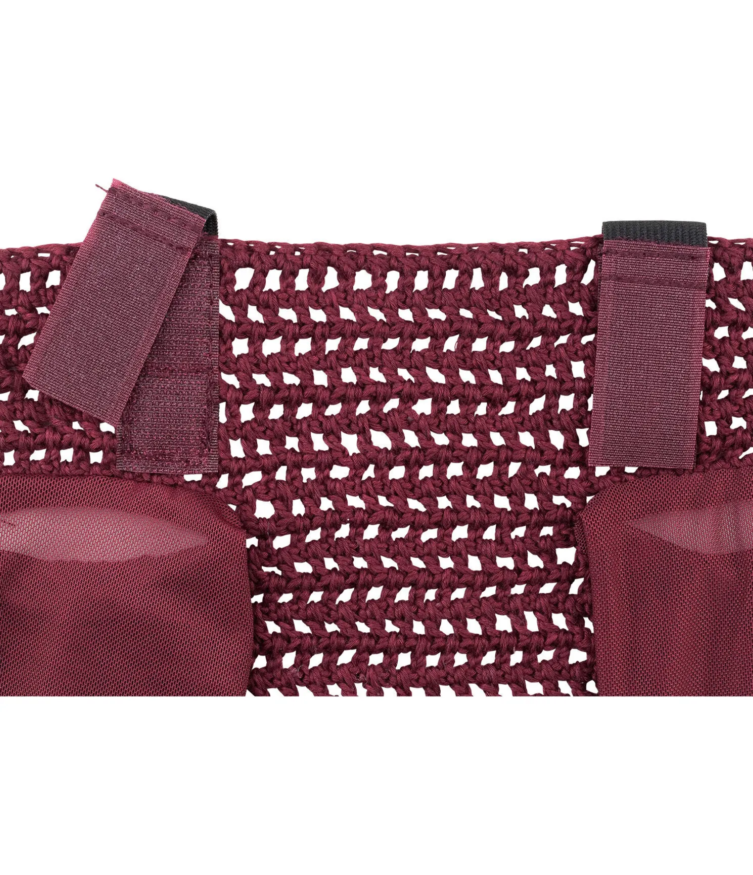Bonnet anti-mouches en maille avec logo cousu et impression 3D métallisée. Matière extensible aux oreilles pour un confort optimal. Deux pattes auto-agrippantes élastiques pour le fixer à la têtière du bridon. Masque 100 % polyester, oreilles 97 % polyester, 3 % élasthanne.