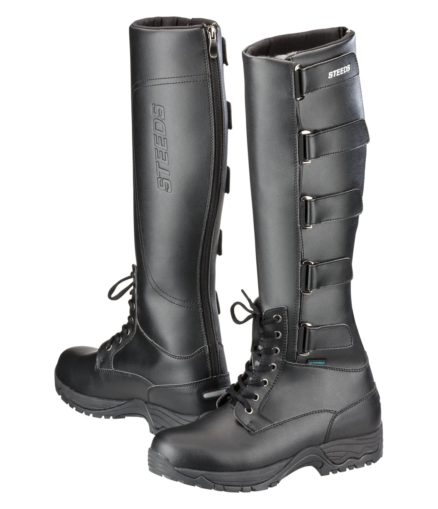 Bottes d’équitation d’hiver imperméables en PU ésistant. Semelle Double Layer pour une assise plantaire optimale avec semelle intermédiaire en EVA pour absorber les chocs et semelle extérieure en caoutchouc, résistante à l’usure. Doublure intérieure en polaire (100 % polyester) au niveau de la tige et du pied. Revêtement imperméable pour éviter que l’eau ne s’infiltre. Longue fermeture à glissière à l’arrière et cinq pattes auto-agrippantes latérales pour un enfilage rapide et un ajustement optimal à la forme du mollet. Laçage à l’avant pour un maintien ferme dans la botte. Bande réfléchissante à l’arrière pour plus de sécurité.