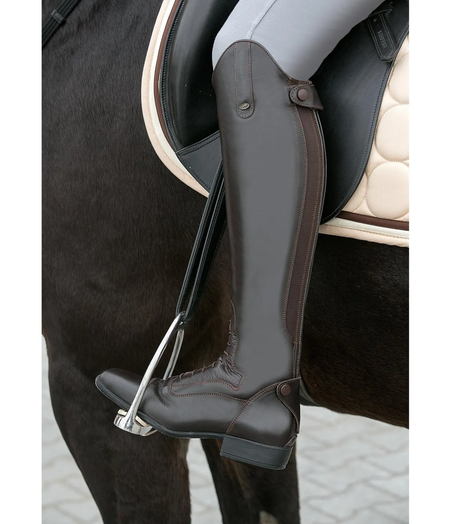 Bottes élégantes, à lacets, en cuir de vachette pleine fleur. Le cuir est souple tout en étant très robuste. Doublure en cuir de porc souple. Fermeture à glissière OPTI au dos. Empiècement élastique sur un côté pour une adaptation parfaite au mollet. Avec un cuir pleine fleur doux au niveau du laçage pour bien maintenir le talon en bas dans l’étrier. Pied de forme carrée élancé. Autres caractéristiques : voûte plantaire absorbant les chocs avec semelle intérieure amovible, semelle extérieure en caoutchouc résistant à l’usure et rabat au talon. Fabriquées en Portugal. Cuir italien.