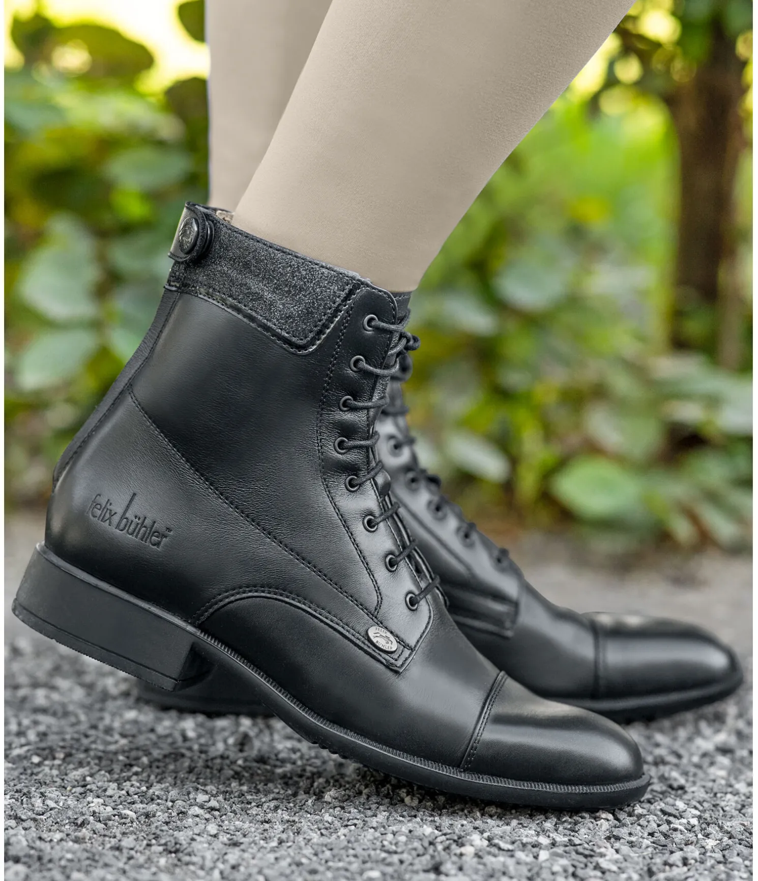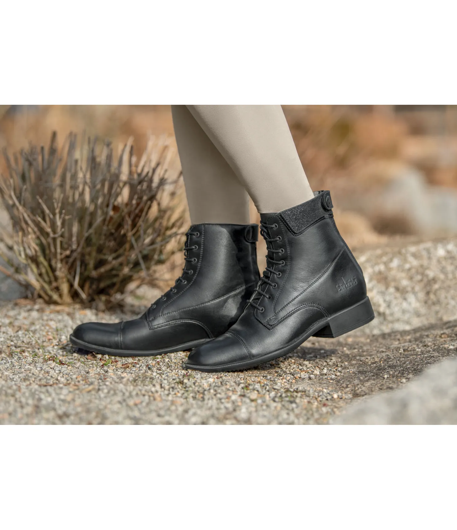 Bottines à lacets. Dessus en cuir de vachette italien pleine fleur avec doublure en cuir de porc souple. Insert scintillant sur le haut de la bottine. Facile à mettre grâce à la fermeture à glissière arrière, terminée par un bouton-pression. Semelle extérieure à bout carré en caoutchouc résistant. Semelle intérieure amovible avec assise plantaire absorbant les chocs. Fabriquées au Portugal.