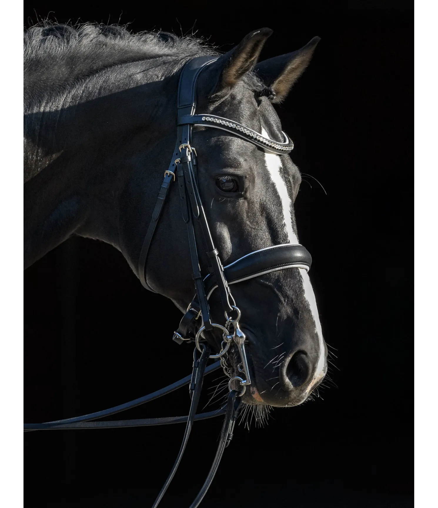 Bride en cuir gras Premium de grande qualité avec muserolle suédoise anatomique, dont la forme offre davantage de place au mors de bride. Têtière et muserolle en cuir particulièrement souple. Ce cuir très flexible permet une répartition optimale des pressions au niveau des oreilles, de la première vertèbre cervicale et de l’os du nez. Pad de menton doux et frontal vague avec strass blancs. Rênes et montants des mors avec fermetures à crochet. Avec rênes et rênes de bride en cuir, sans mors.