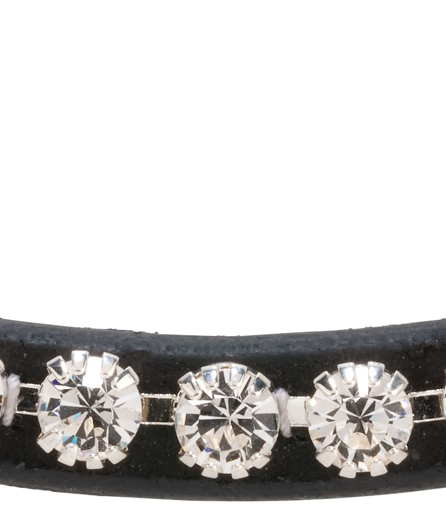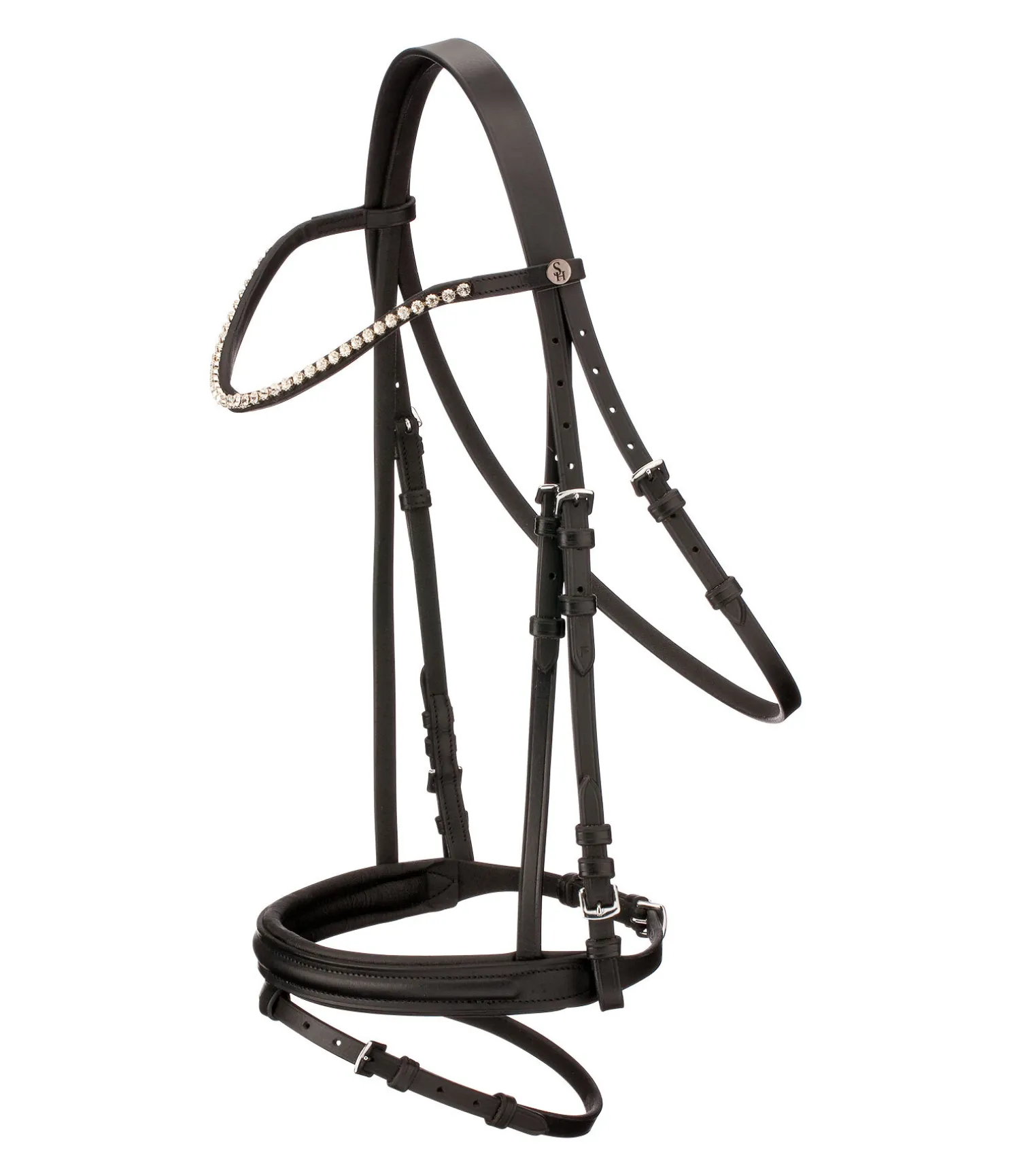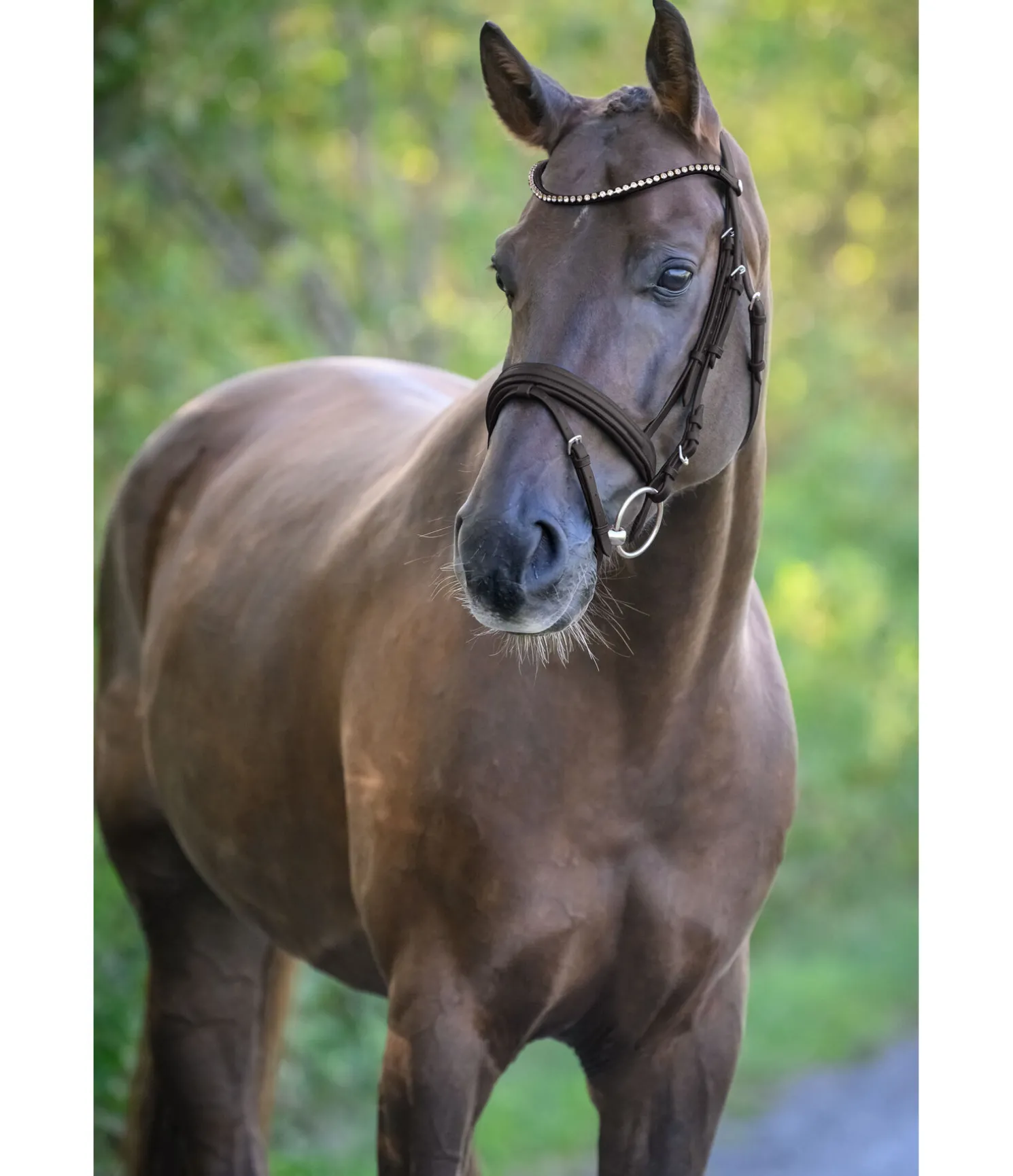 Bridon avec muserolle française combinée et frontal vague avec strass. La doublure douce de la muserolle offre un confort optimal. En cuir véritable. Bouclerie argentée. Sans rênes et sans mors.