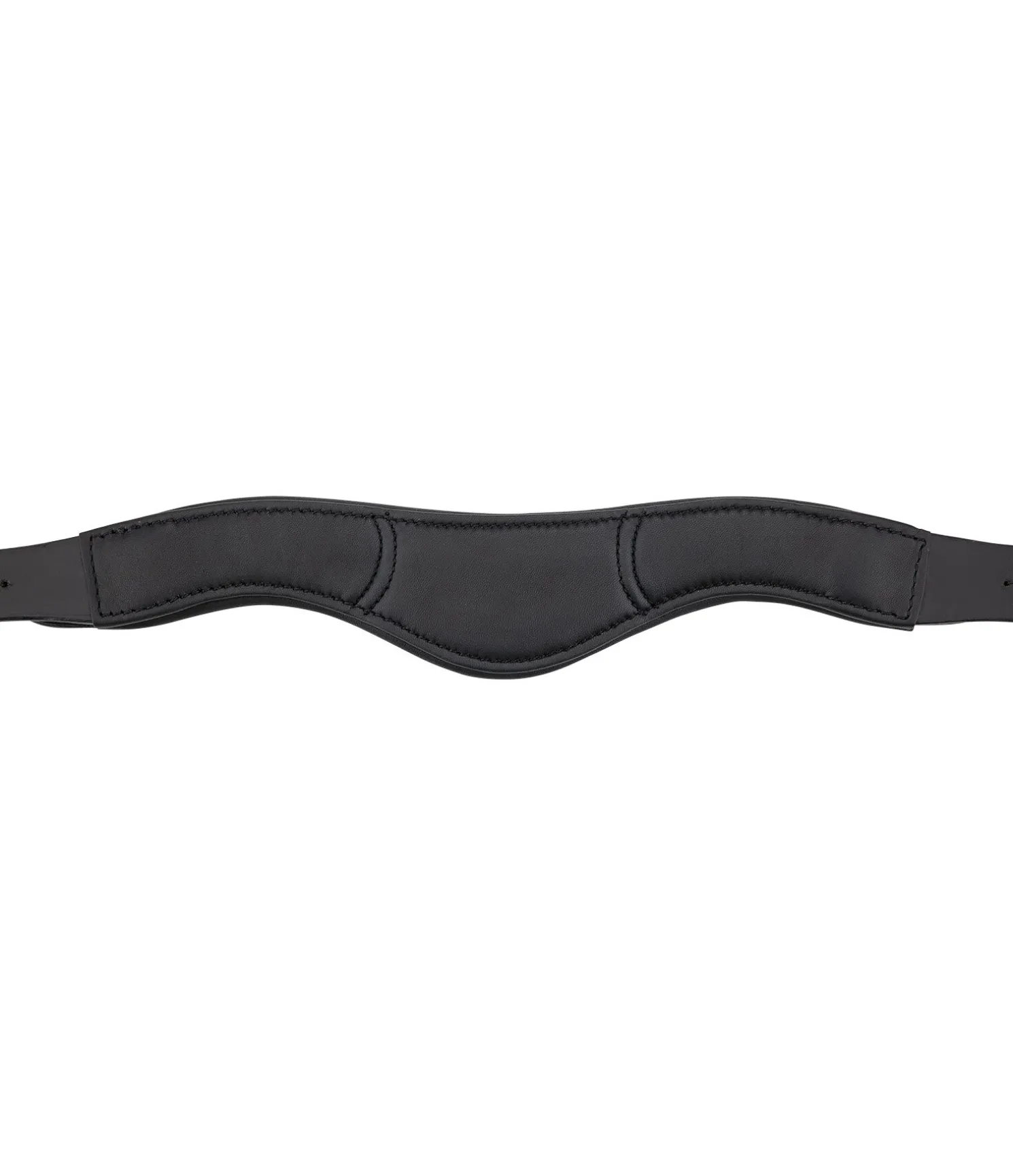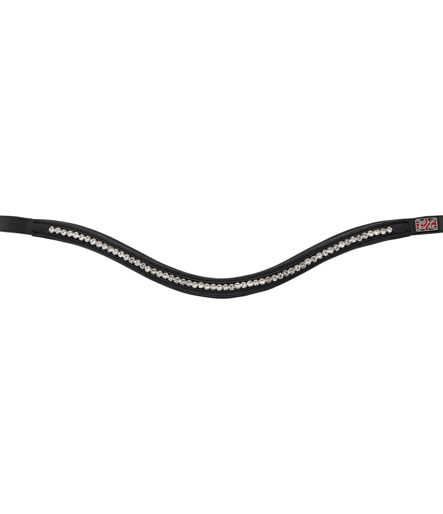 Bridon particulièrement souple avec muserolle allemande. Têtière anatomique. Frontal vague orné de strass. Têtière, frontal, muserolle et pad de menton avec doublure douce en cuir véritable. Muserolle réglable. Bouclerie argentée. Sans rênes sangle, sans mors.