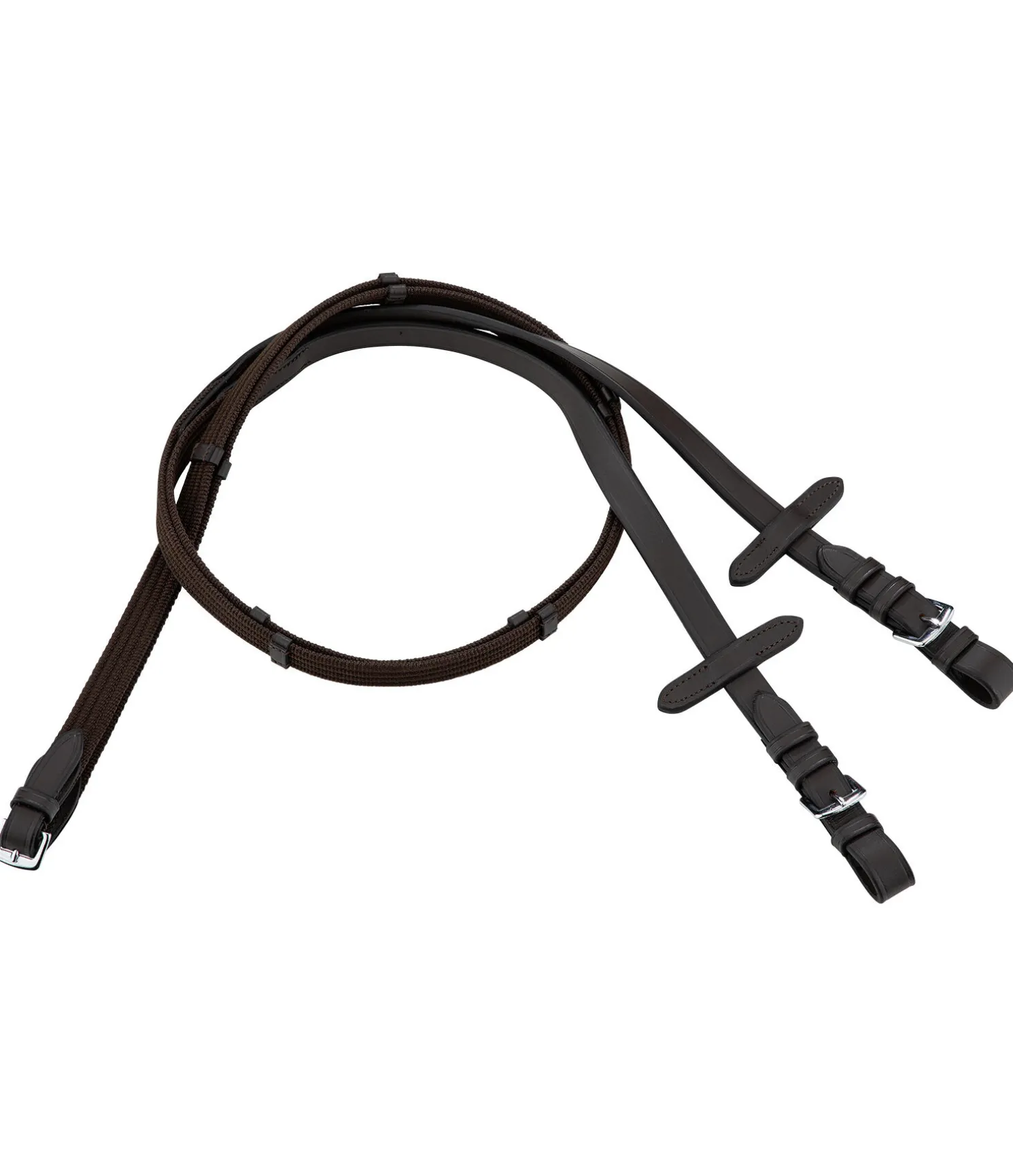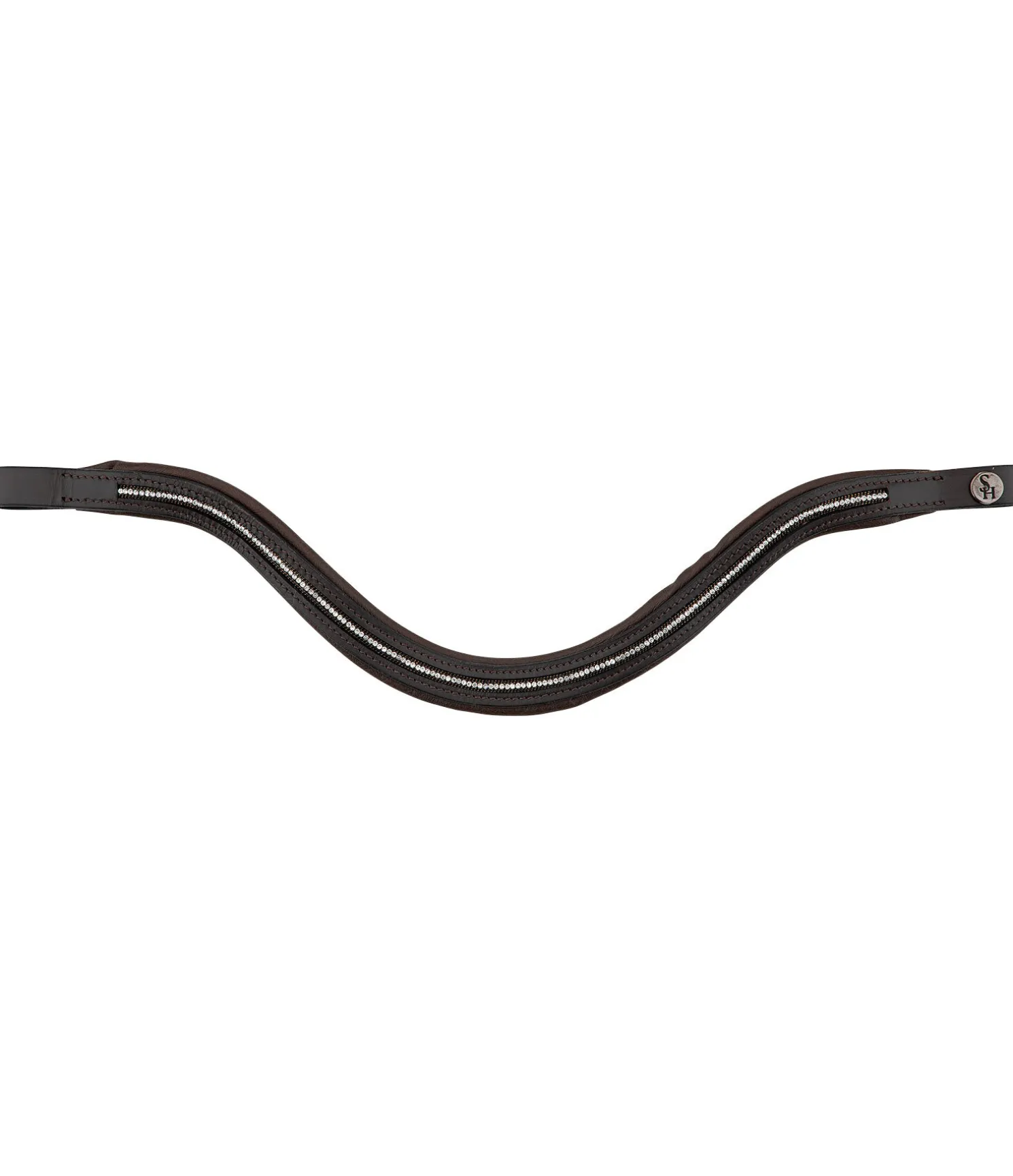 Adorable bridon avec muserolle combinée, conçu spécialement pour les mini-shetlands. Têtière et muserolle avec coupe droite, muserolle avec doublure douce. Frontal vague avec de nombreux strass scintillants. Bouclerie argentée. Avec rênes sangle, sans mors.