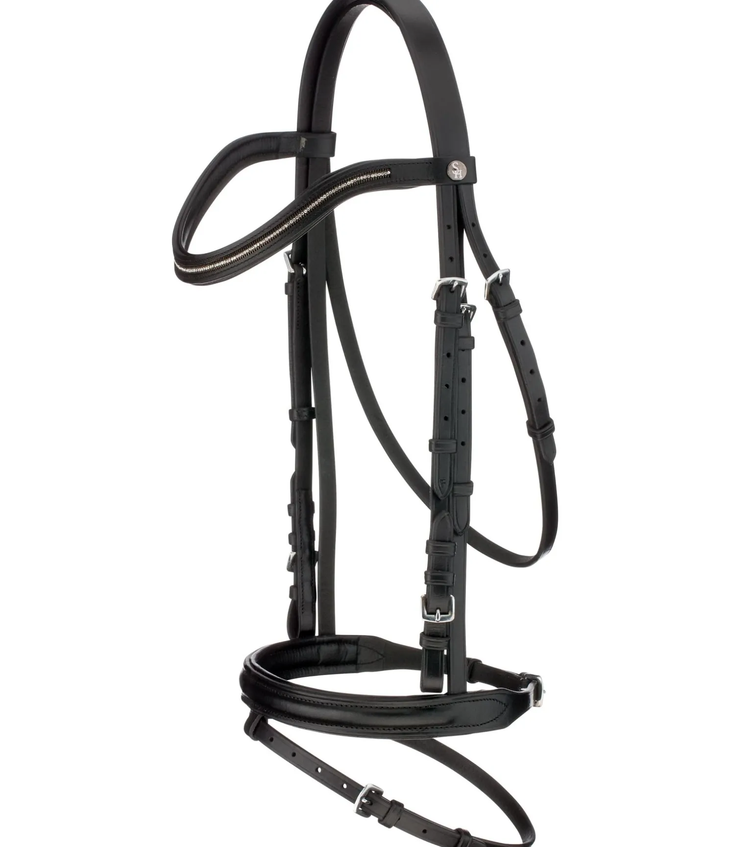 Adorable bridon avec muserolle combinée, conçu spécialement pour les mini-shetlands. Têtière et muserolle avec coupe droite, muserolle avec doublure douce. Frontal vague avec de nombreux strass scintillants. Bouclerie argentée. Avec rênes sangle, sans mors.