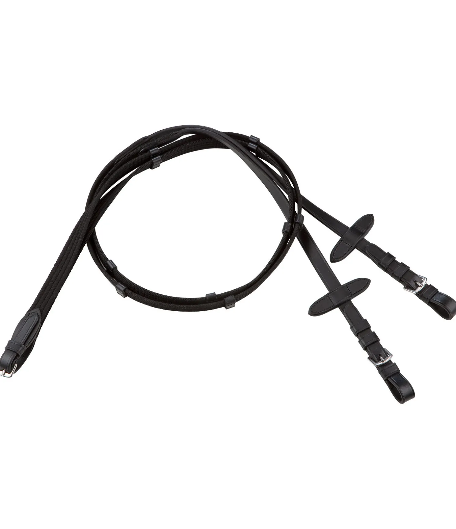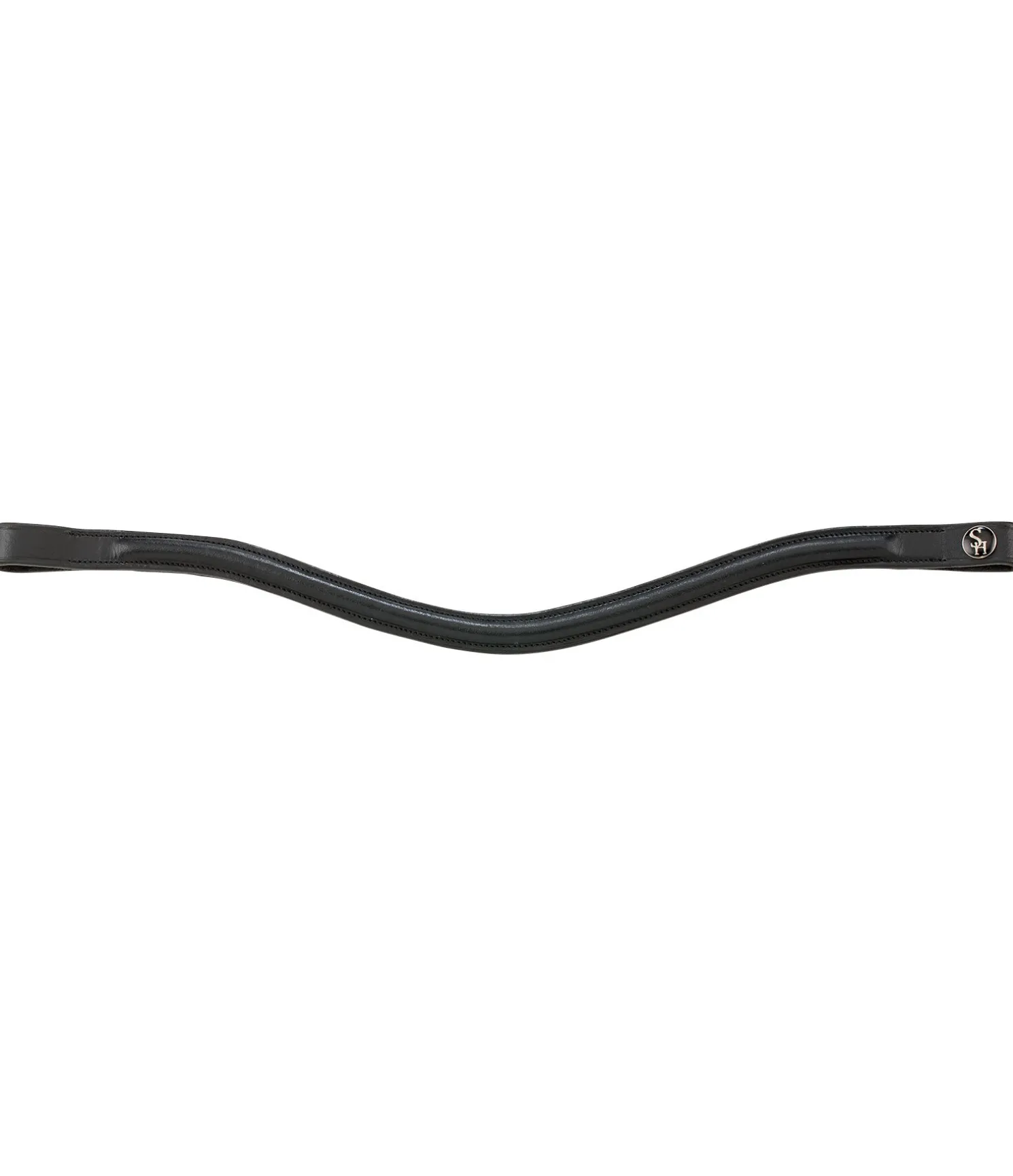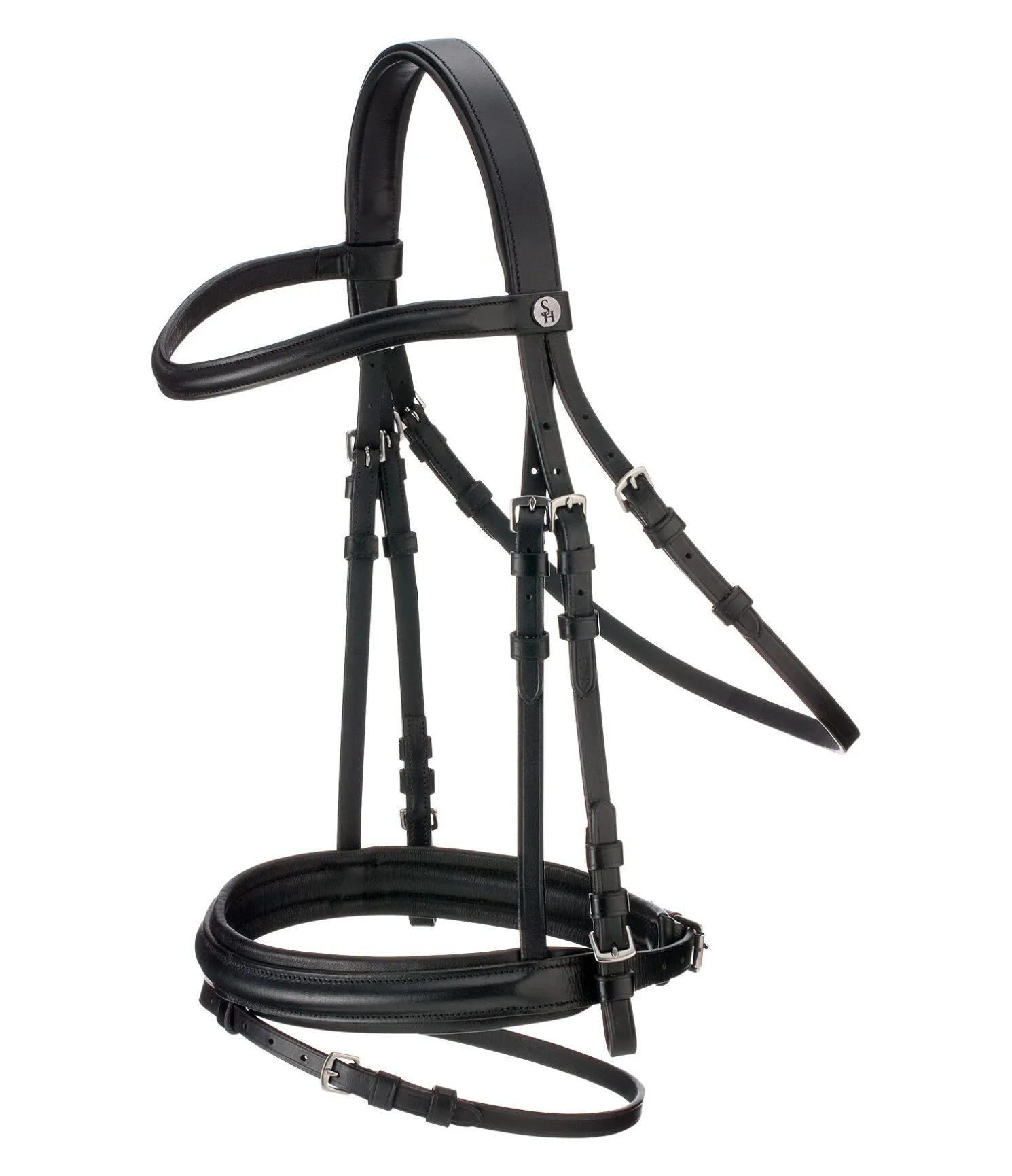 Muserolle française combinée avec frontal vague. Têtière et muserolle avec doublure douce assurant un confort optimal. Cuir véritable. Bouclerie argentée. Avec rênes sangle, sans mors.